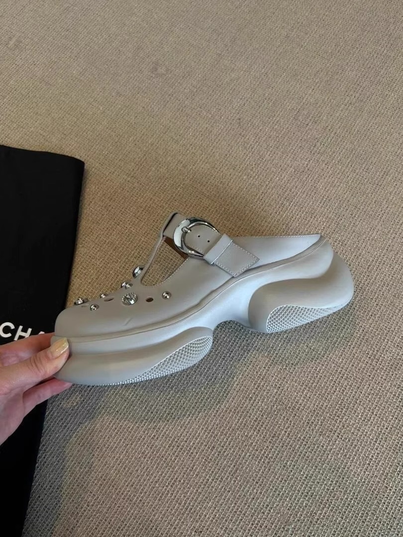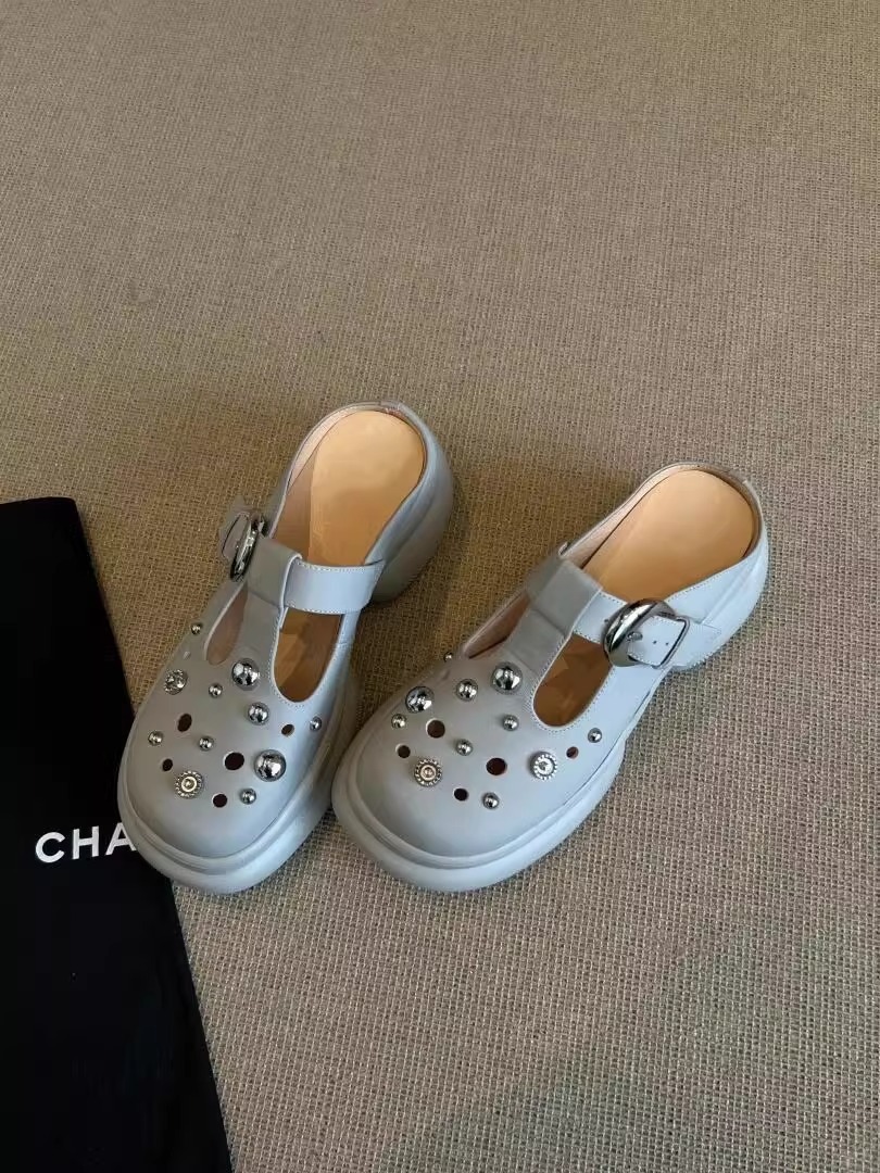 2025 새로운 두꺼운 바닥 Baotou 하프 슬리퍼 여성용 아우터 리벳 할로우 홀 신발 게으른 슬립 온 뮬러 슬리퍼