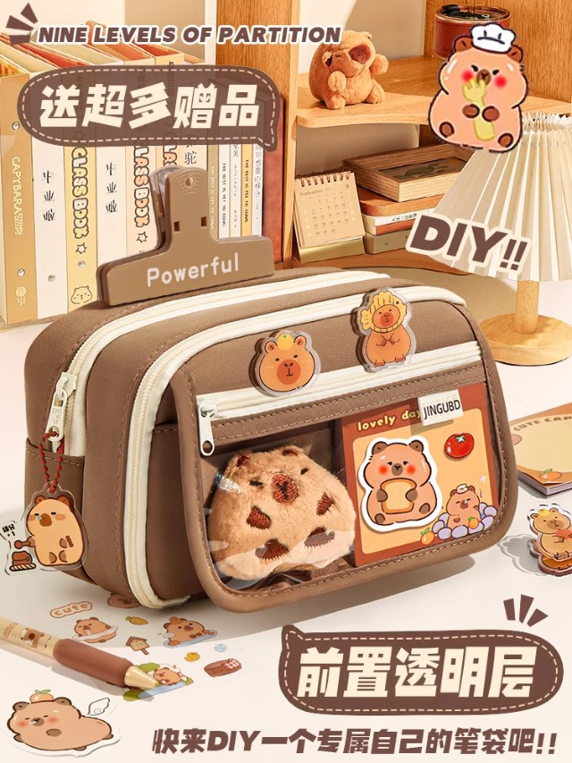 • [두꺼운 업그레이드/상품번호 : FGJ05] 9단 커피색 필통 + 클립 + 펜던트 + 노트 50장 + 카피발라 브로치 + 스티커 20장