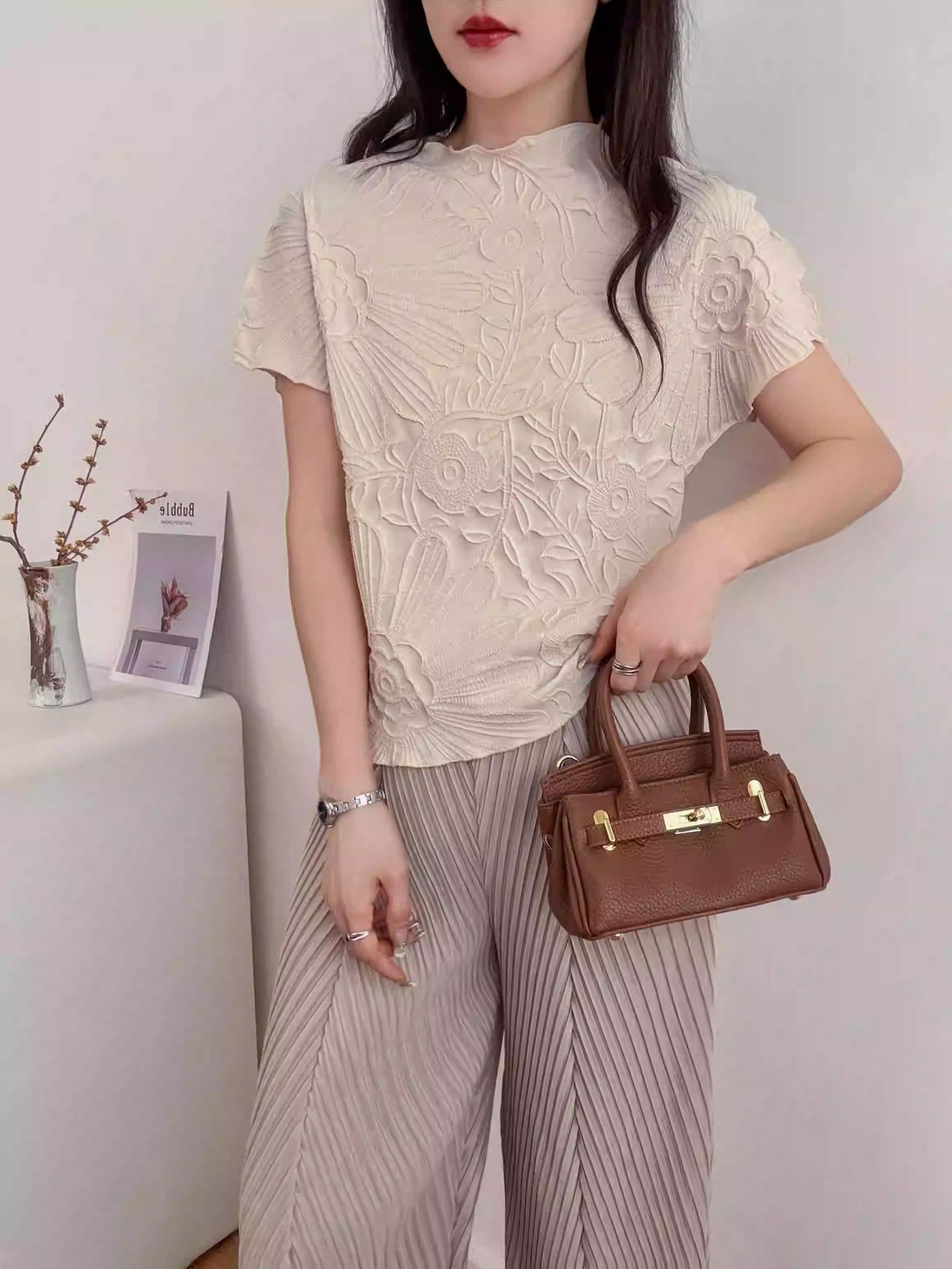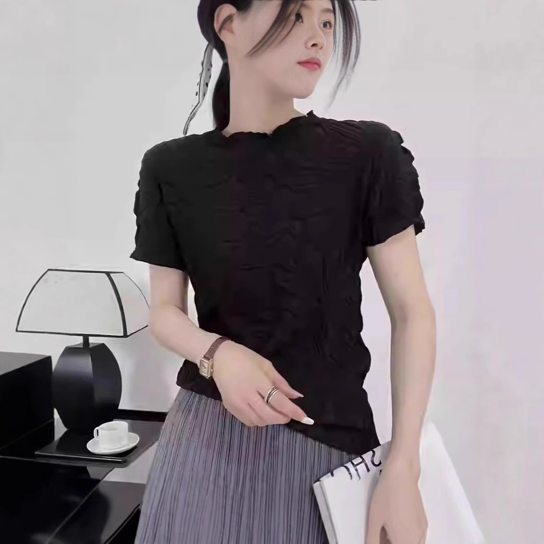 2025 년 여름 새로운 주름 여성 티셔츠 유행 올 매치 보텀 아우터웨어 반팔 주름 무거운 자수 탑