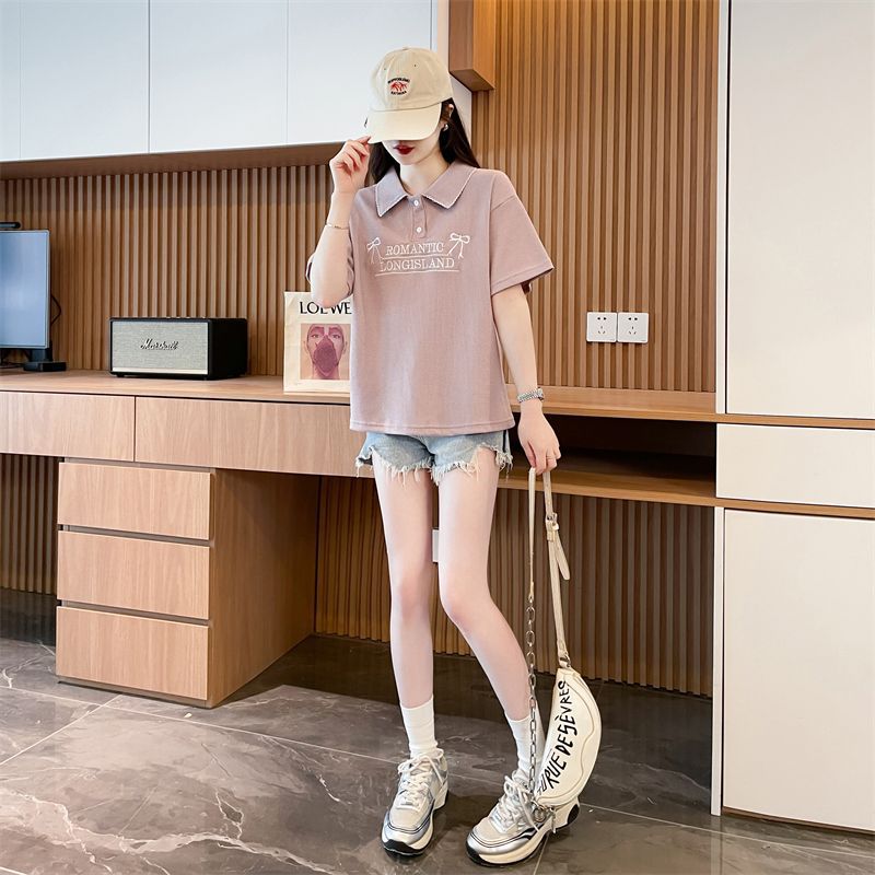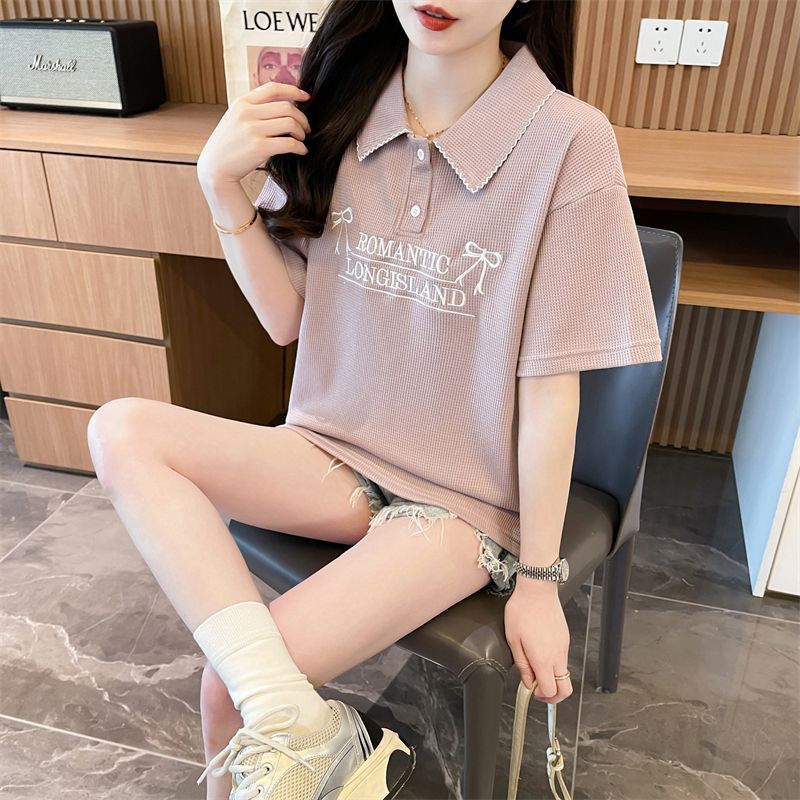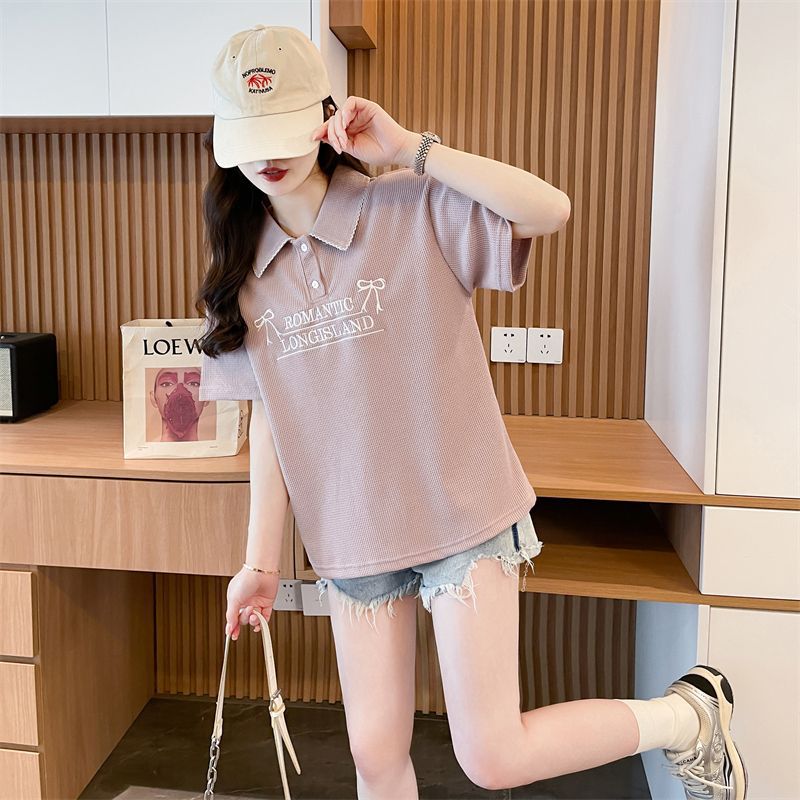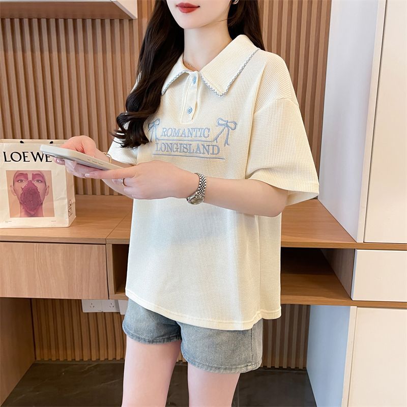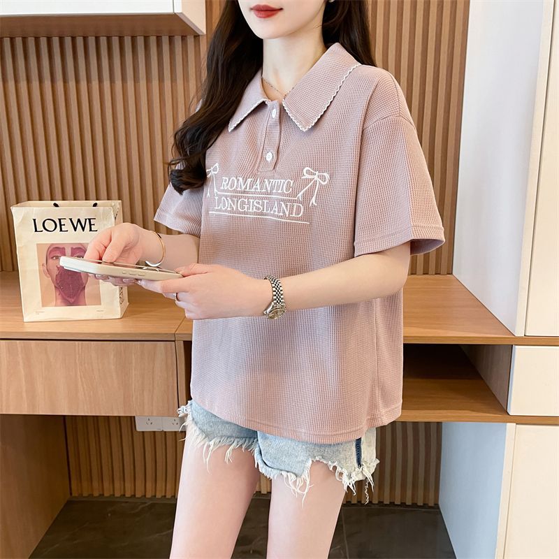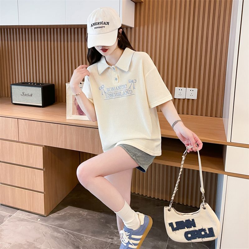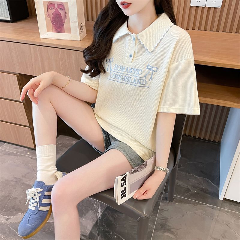 옷깃 폴로 셔츠 반팔 티셔츠 여자 2025 년 새 여름 한국식 느슨한 활 자수 올매치 탑