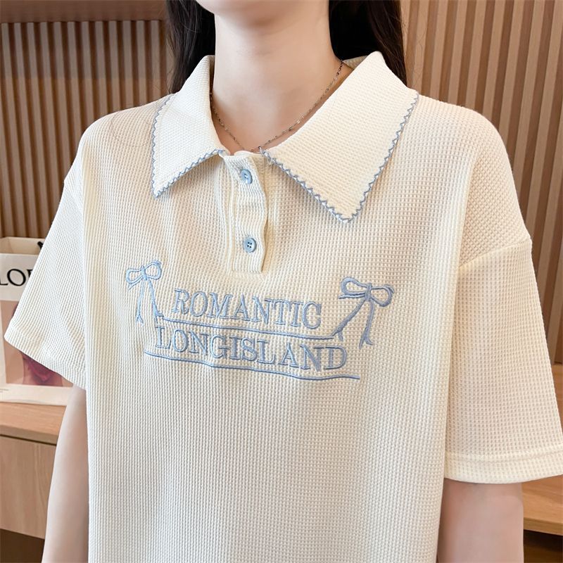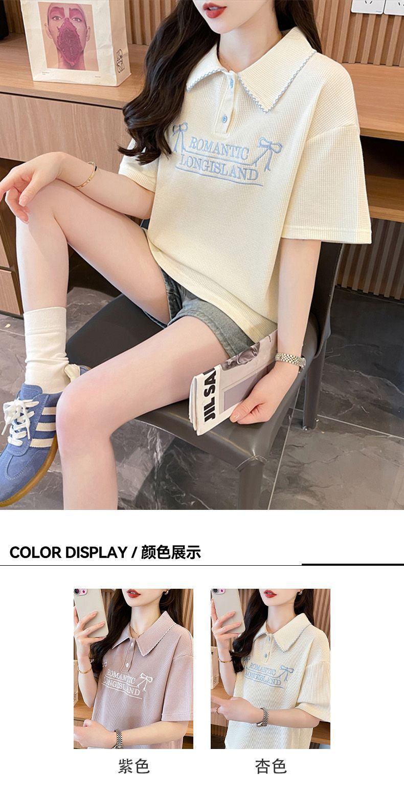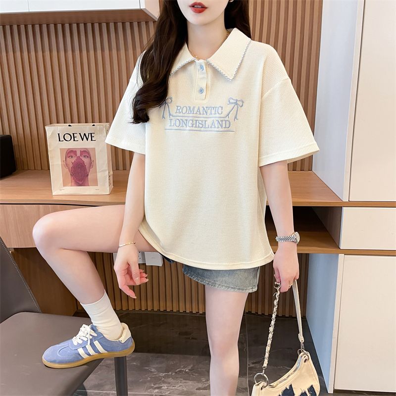 옷깃 폴로 셔츠 반팔 티셔츠 여자 2025 년 새 여름 한국식 느슨한 활 자수 올매치 탑스토어 가기
