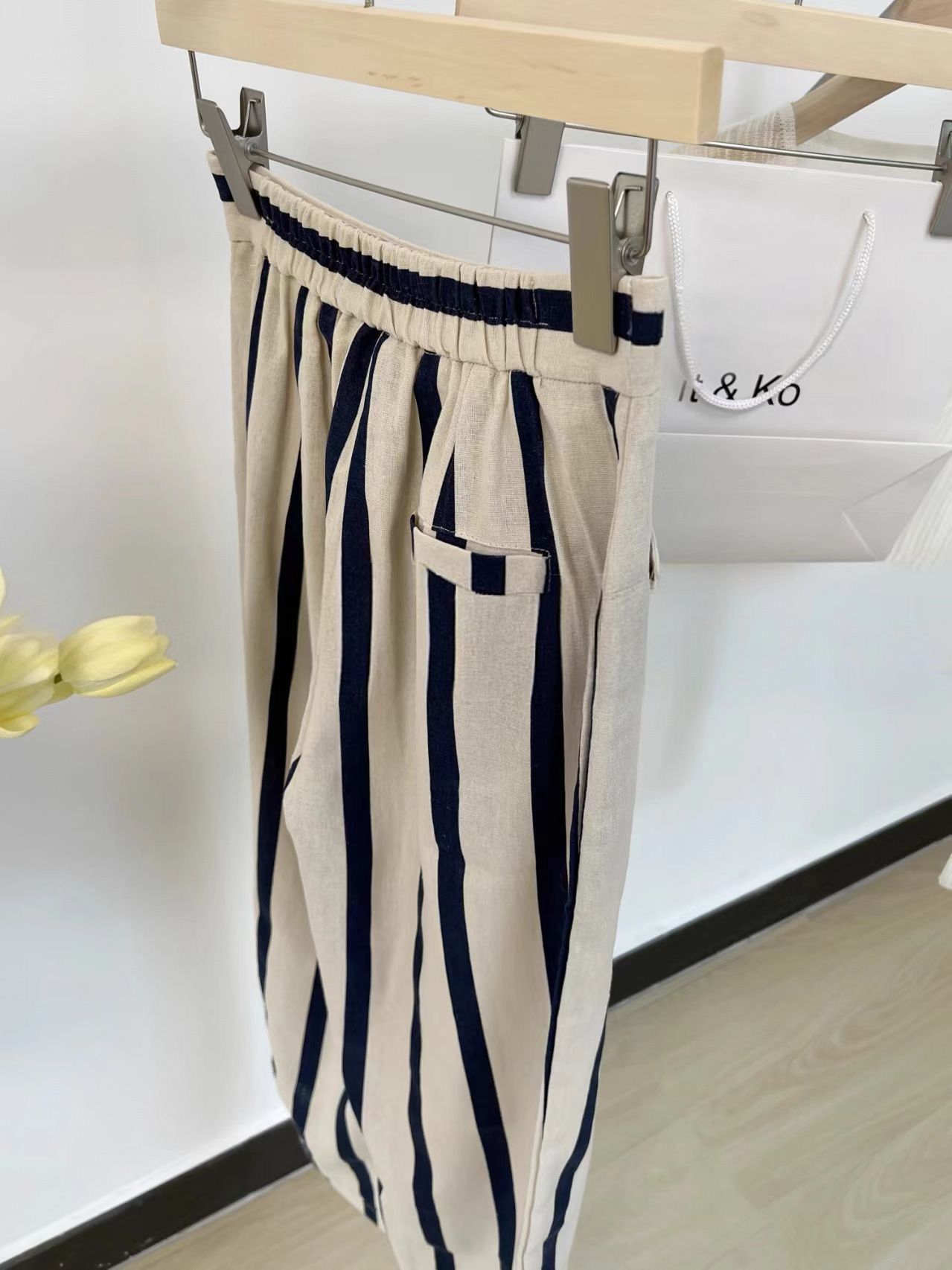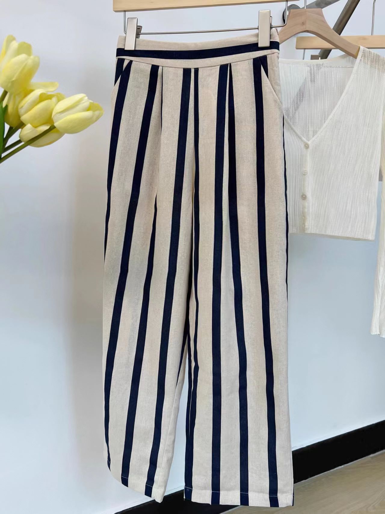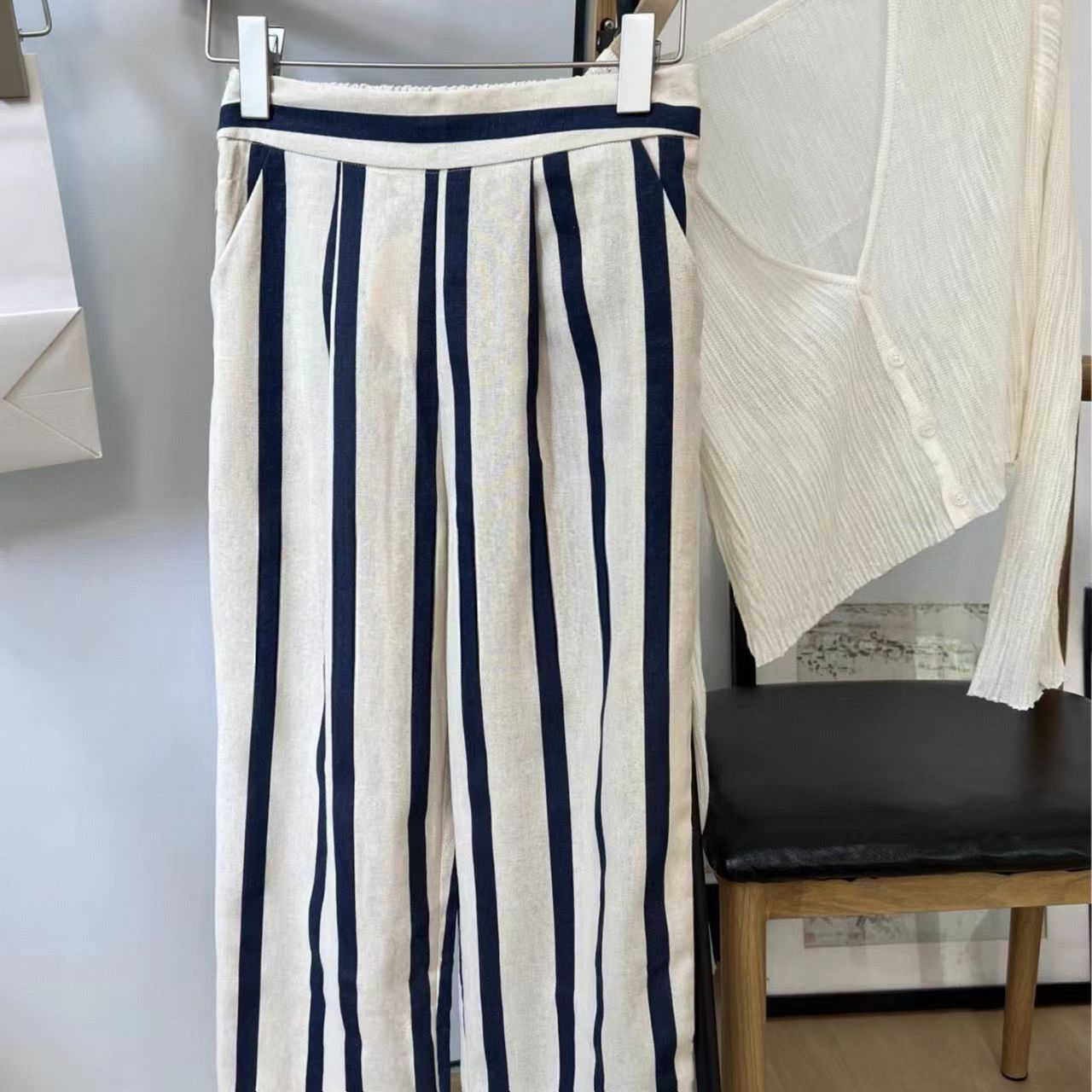 竖条纹棉麻裤子女春秋亚麻阔腿裤小个子九分裤夏季薄款直筒防晒裤