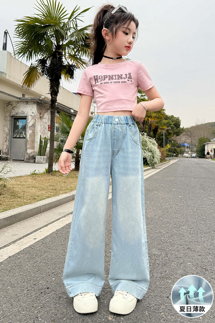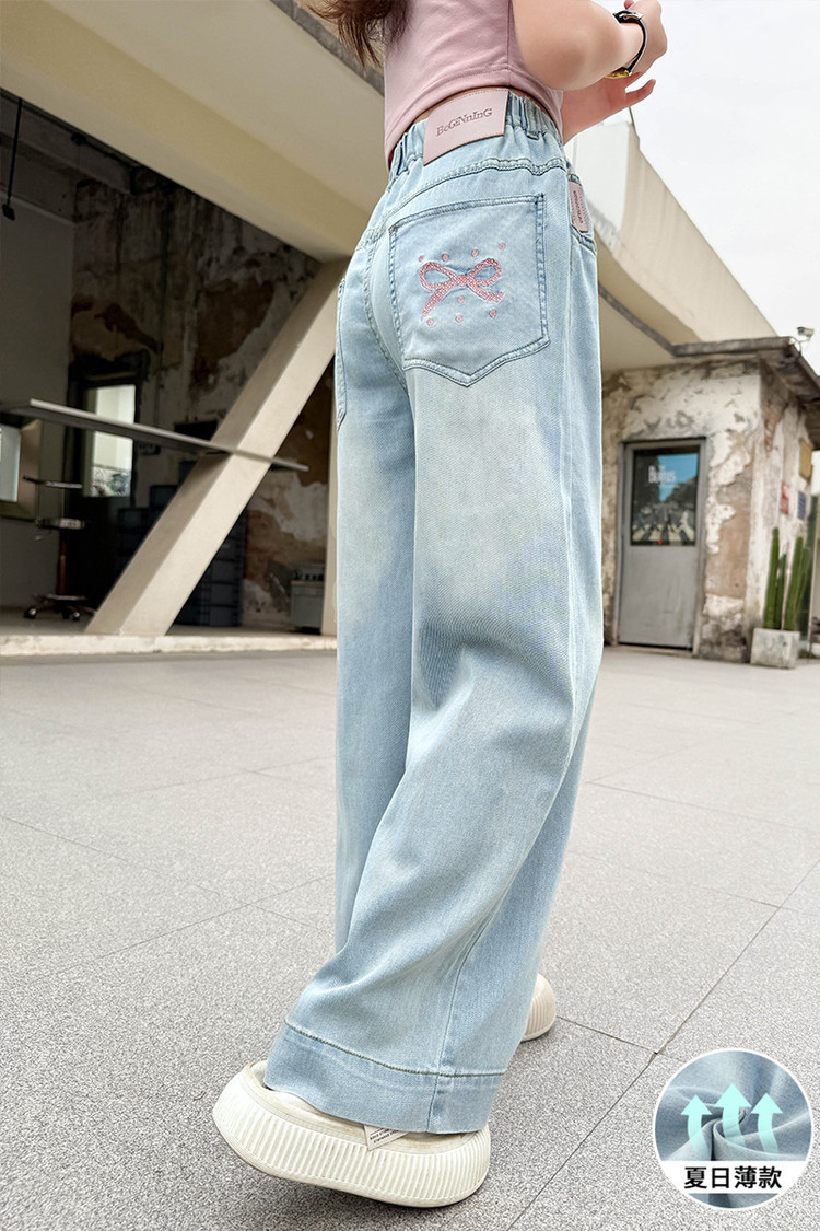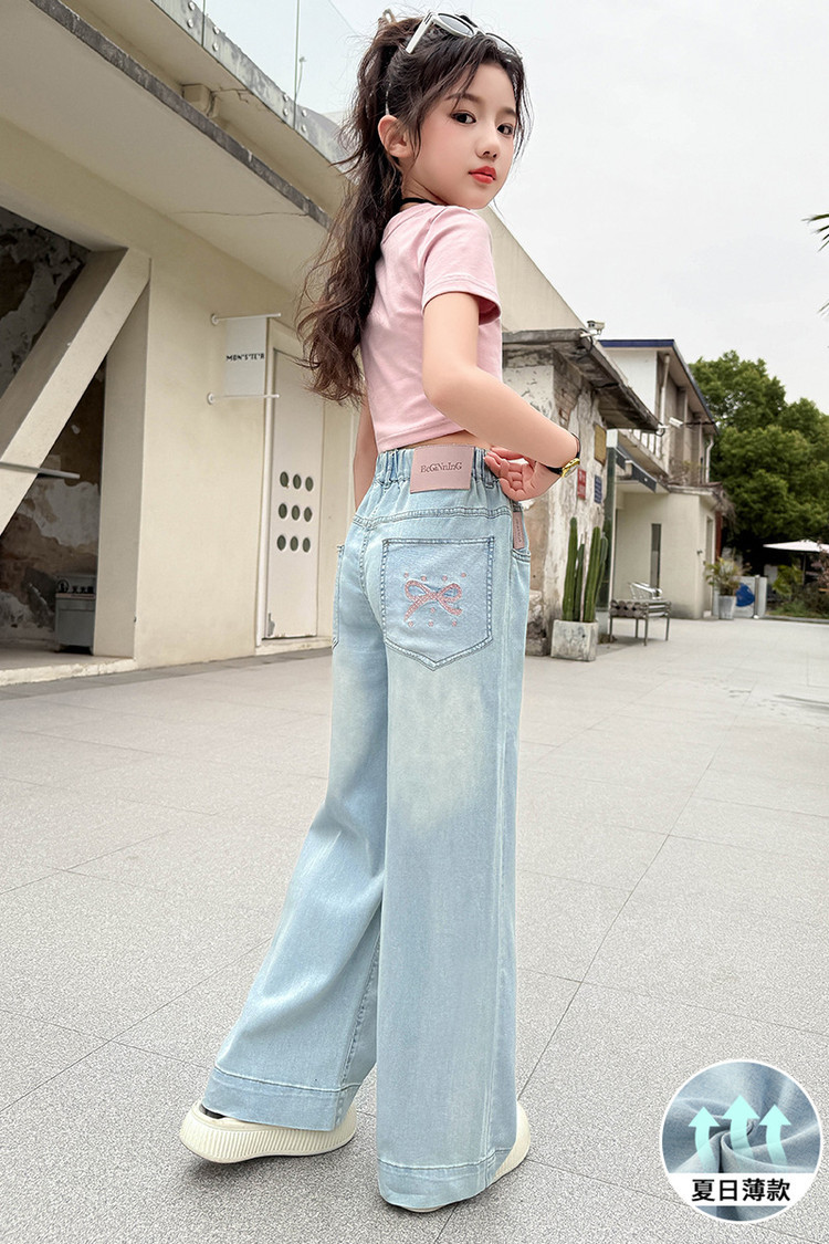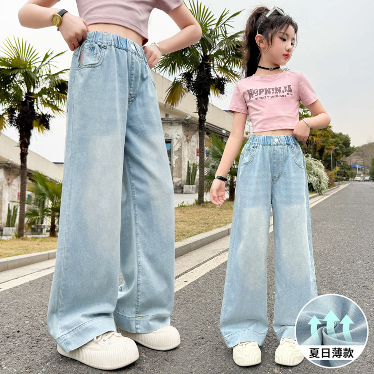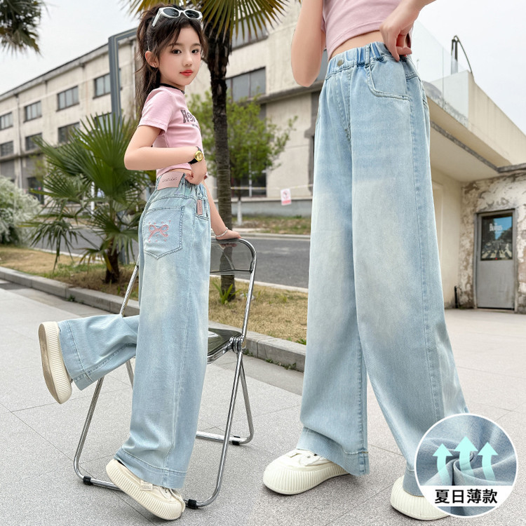 소녀 청바지 2025 새로운 여름 얇은 긴 바지 어린이 바지 소녀 느슨한 넓은 다리 바지스토어 가기