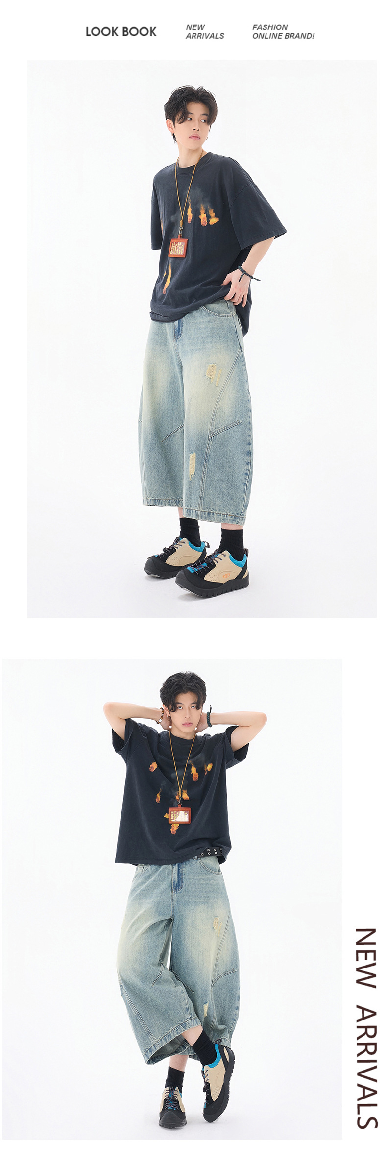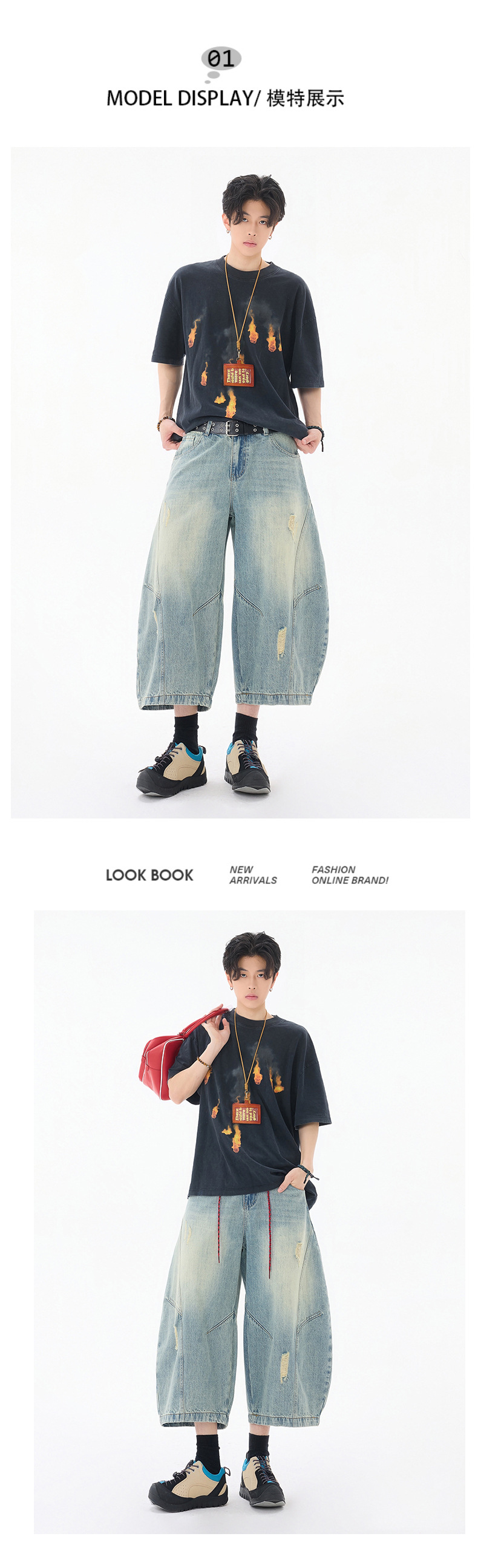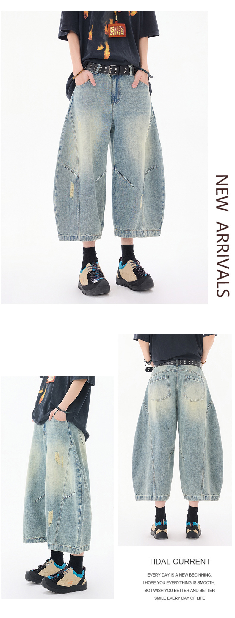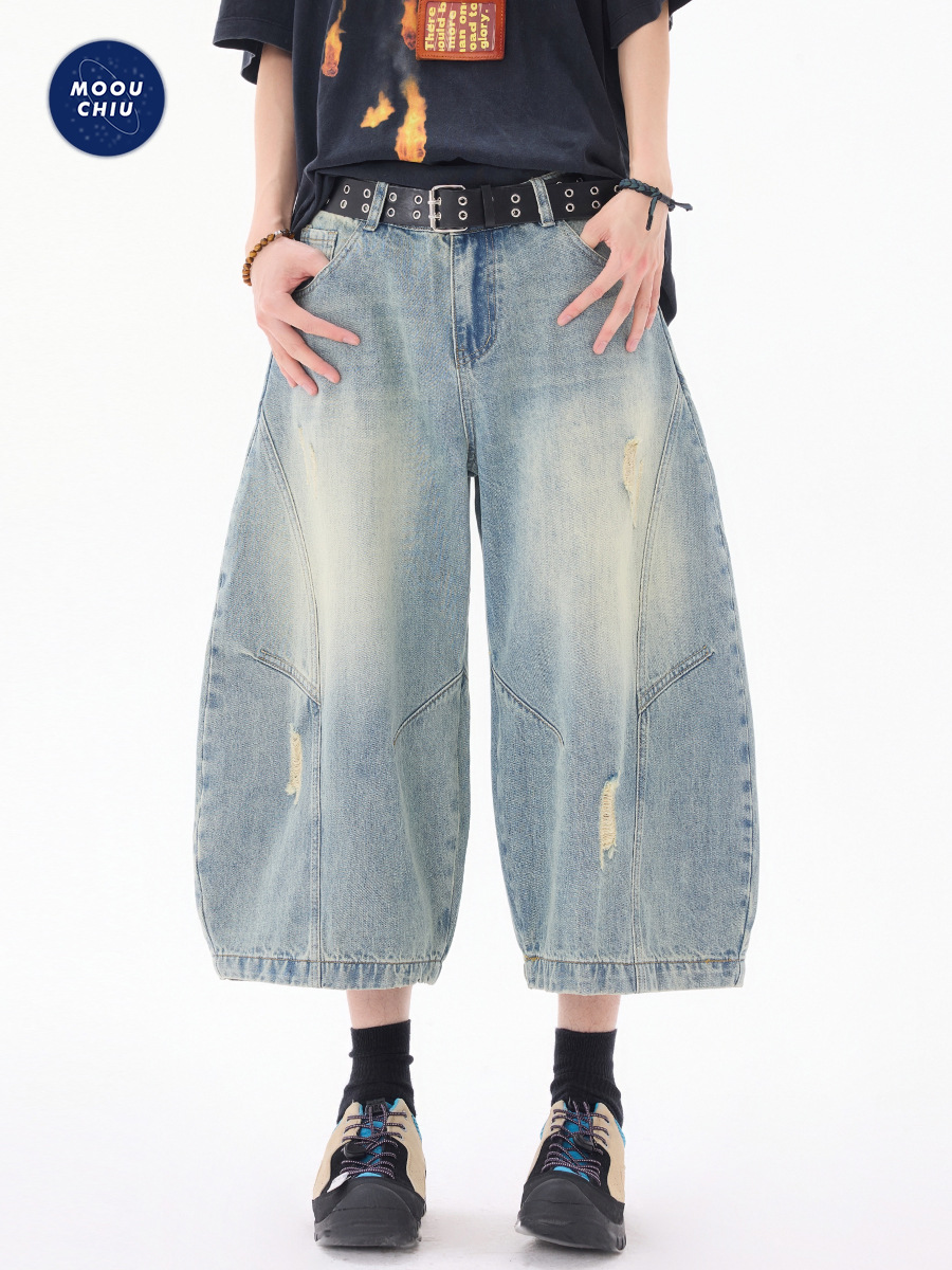 Muqiu 남성복 ∠ 미국 패션 브랜드 Machete 데님 자른 바지 남성용 루즈 레트로 세탁 캐주얼 리핑 반바지스토어 가기