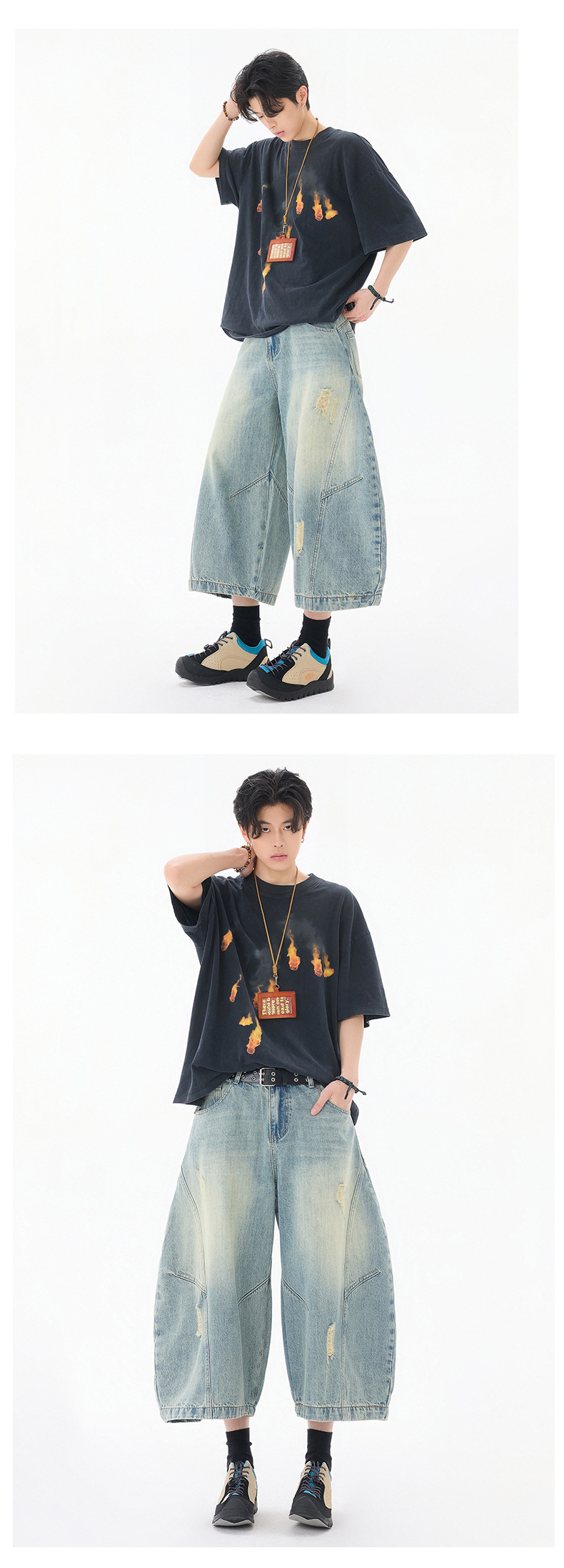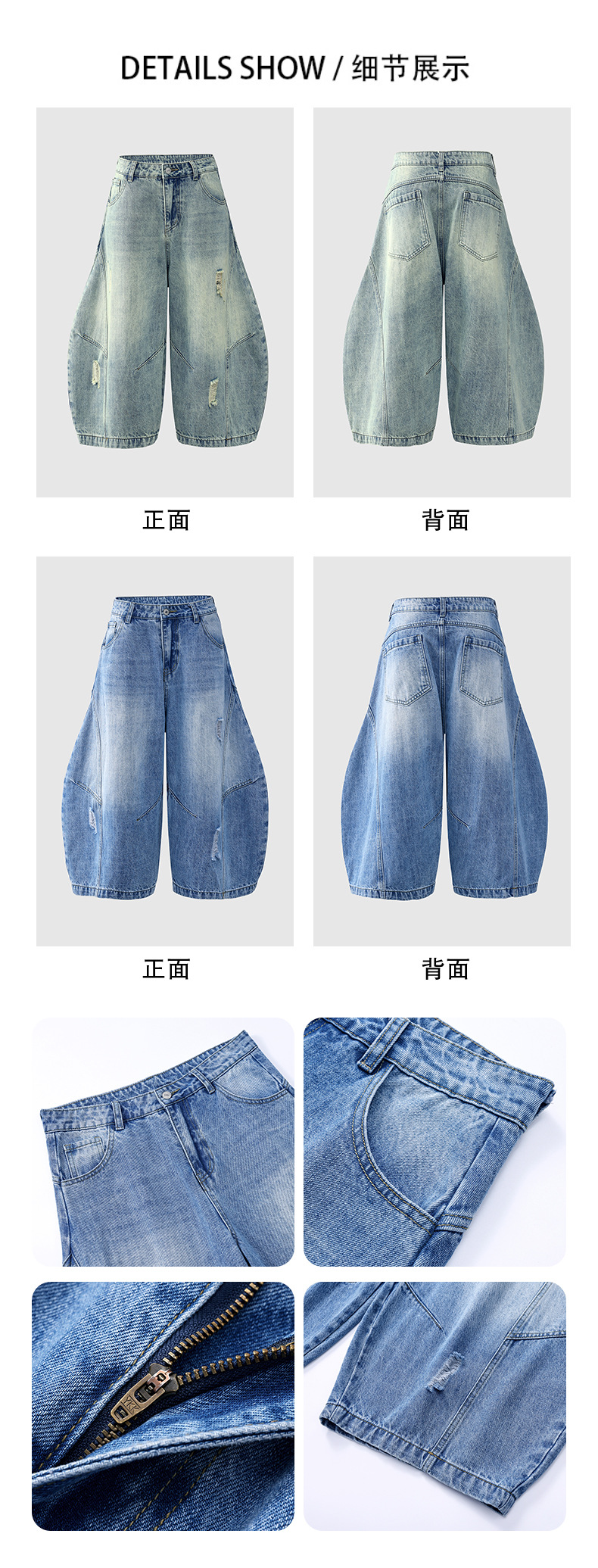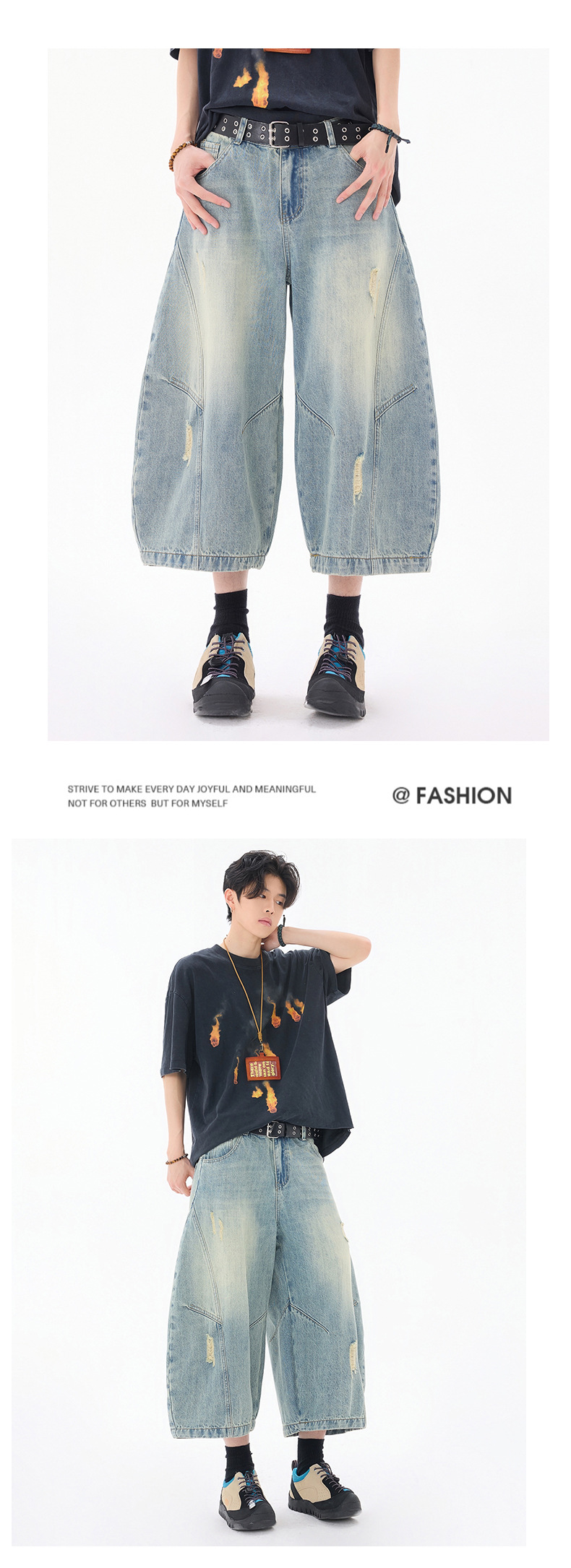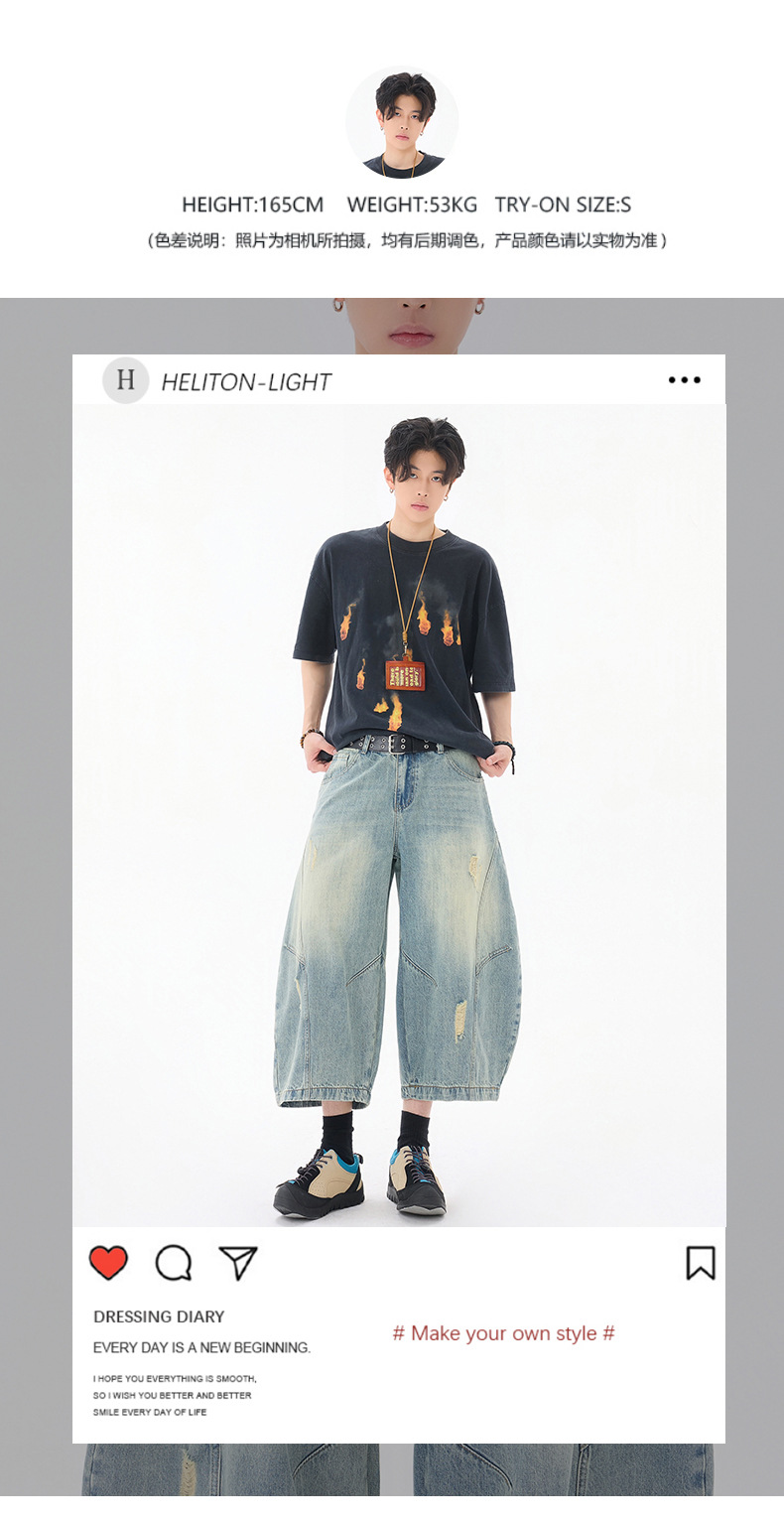 Muqiu 남성복 ∠ 미국 패션 브랜드 Machete 데님 자른 바지 남성용 루즈 레트로 세탁 캐주얼 리핑 반바지스토어 가기