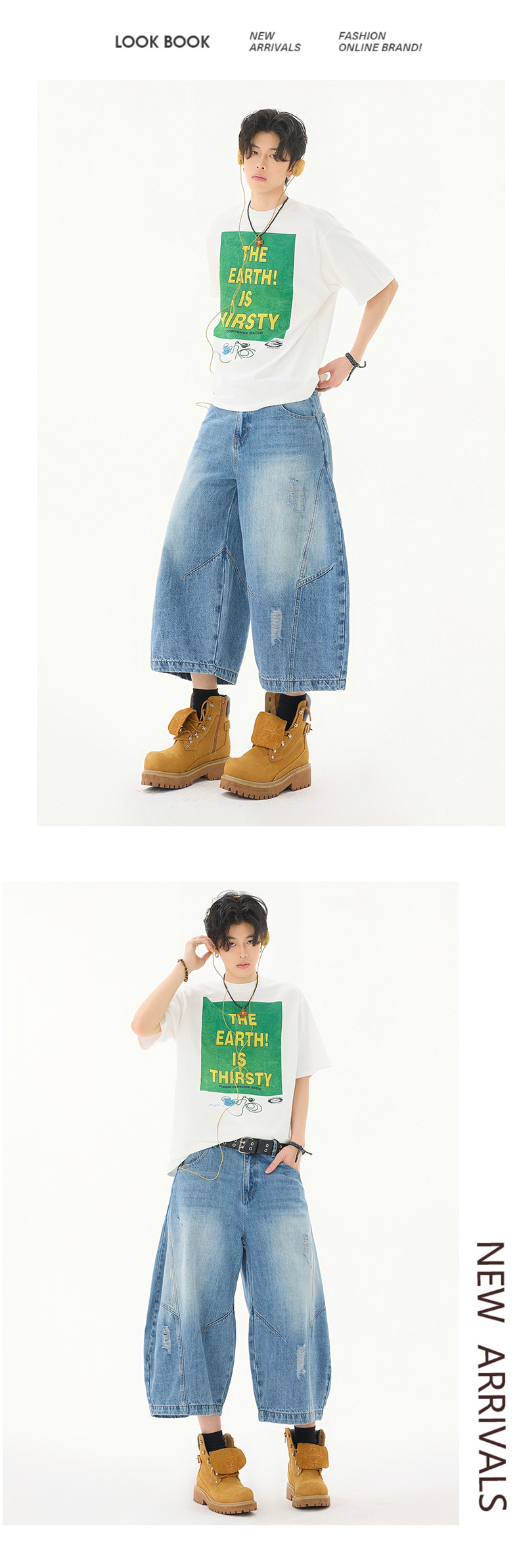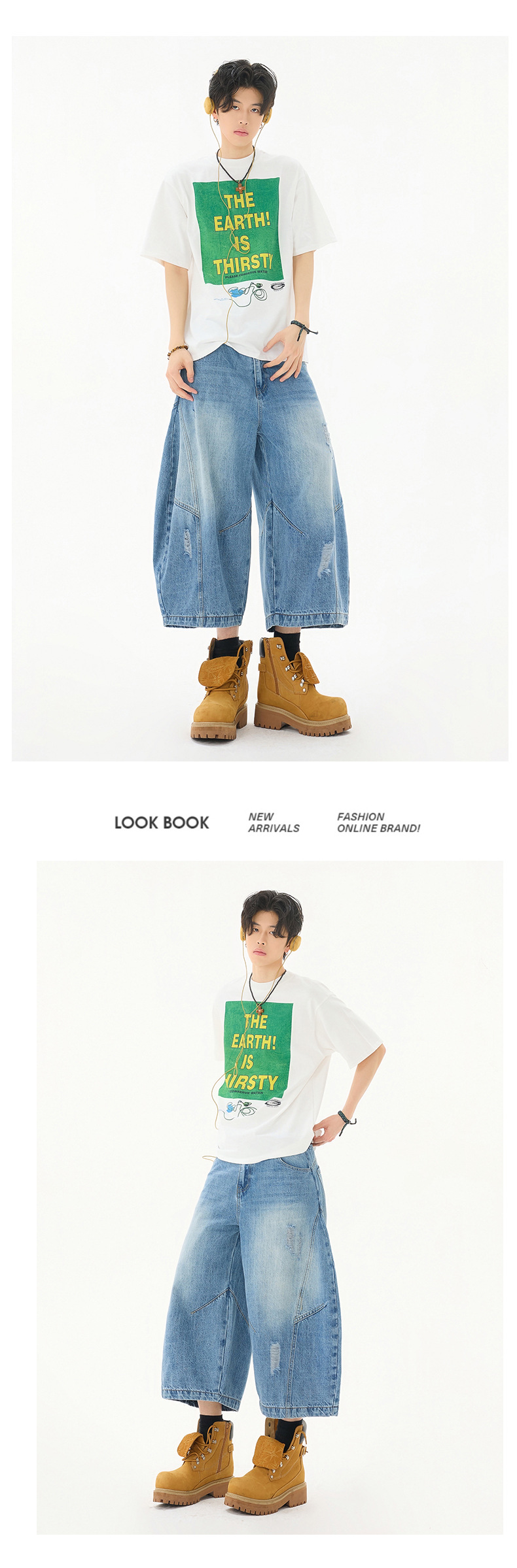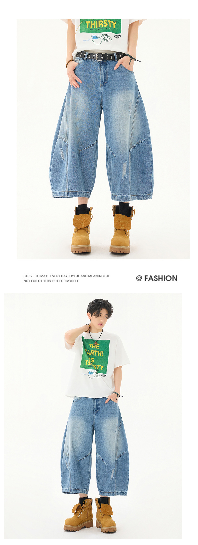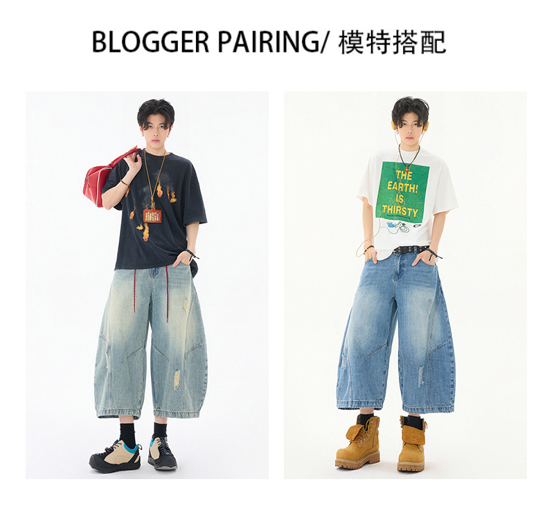 Muqiu 남성복 ∠ 미국 패션 브랜드 Machete 데님 자른 바지 남성용 루즈 레트로 세탁 캐주얼 리핑 반바지스토어 가기