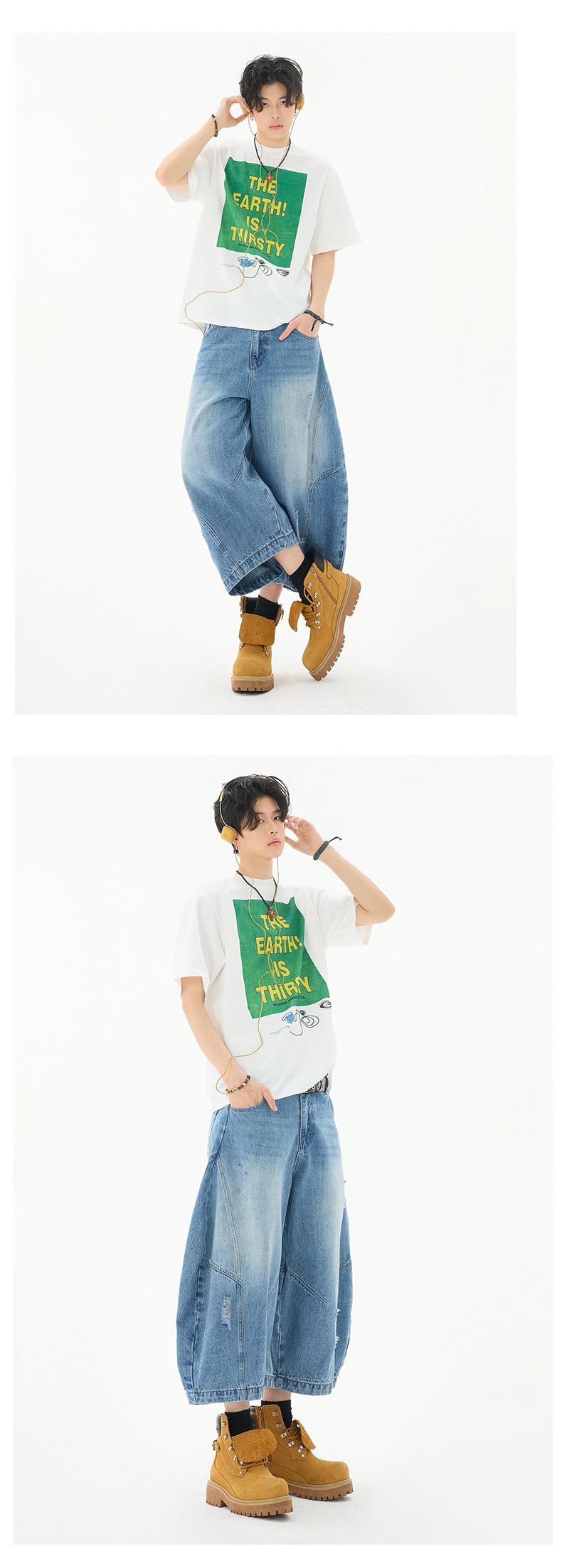 Muqiu 남성복 ∠ 미국 패션 브랜드 Machete 데님 자른 바지 남성용 루즈 레트로 세탁 캐주얼 리핑 반바지