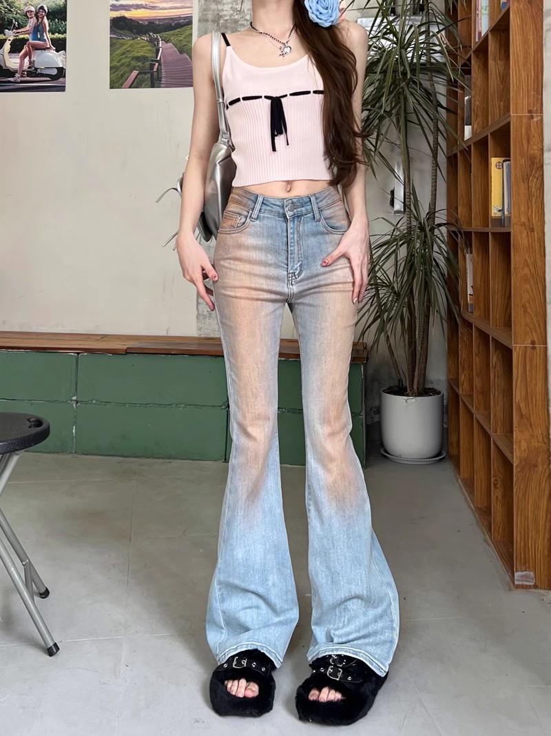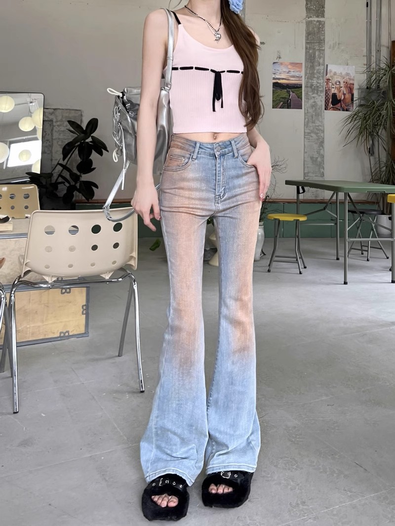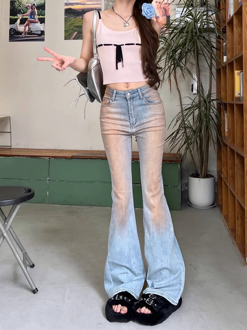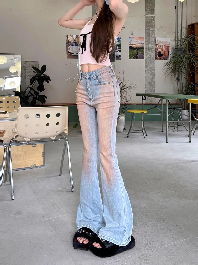 블러시 팬츠 하이 웨이스트 마이크로 플레어 청바지 여성 봄 2024 새로운 그라디언트 컬러 슬림 핏 긴 말굽 바지스토어 가기