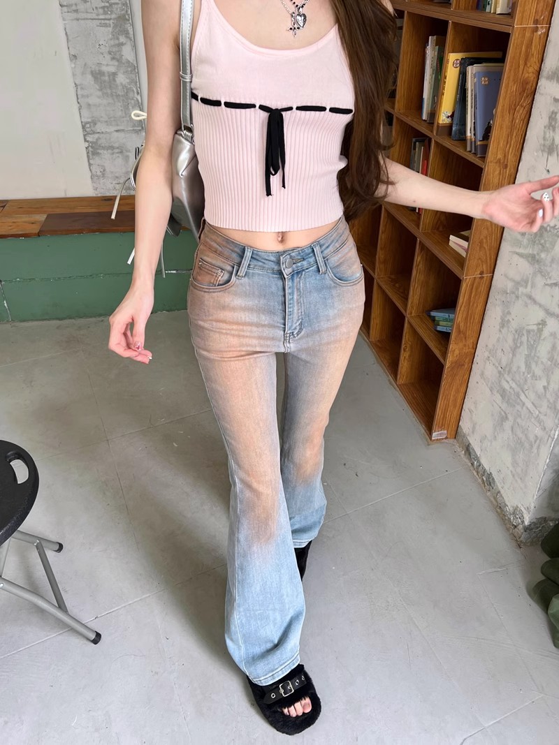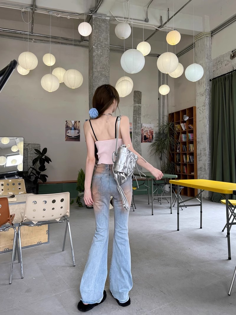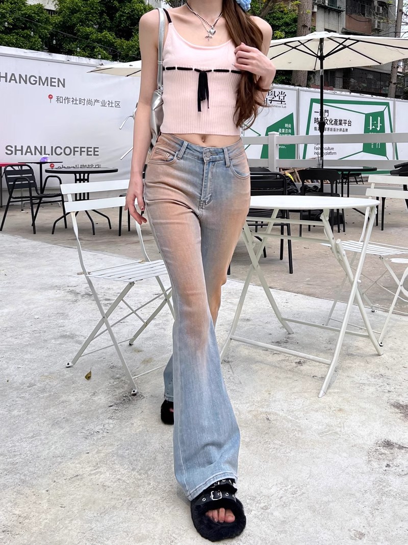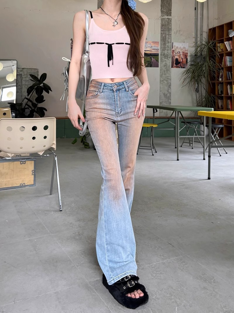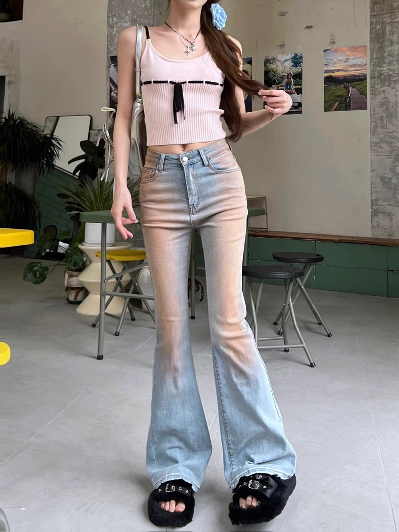 블러시 팬츠 하이 웨이스트 마이크로 플레어 청바지 여성 봄 2024 새로운 그라디언트 컬러 슬림 핏 긴 말굽 바지스토어 가기