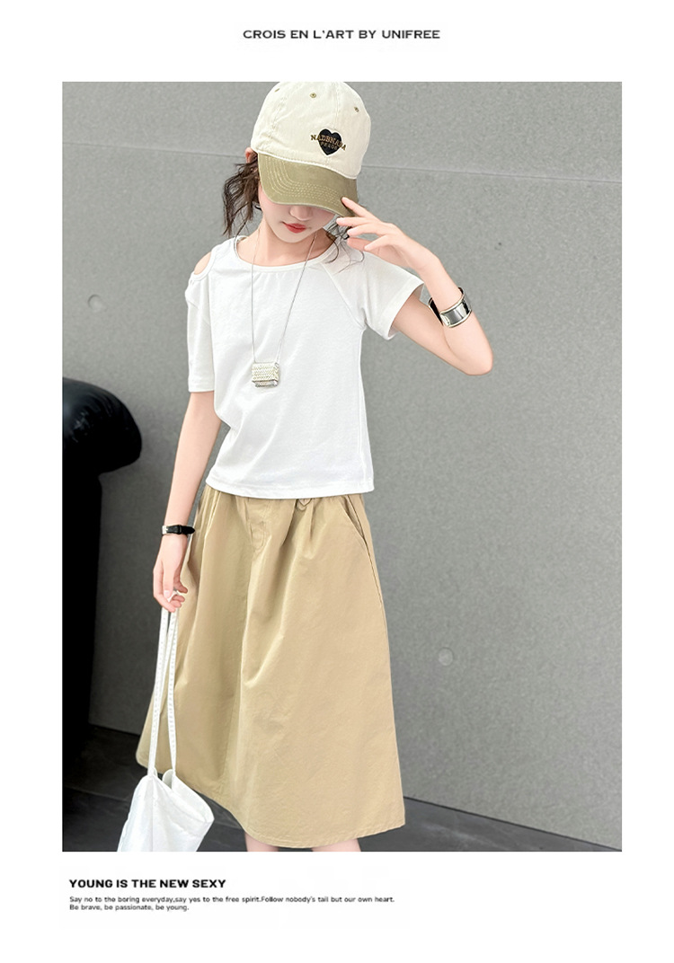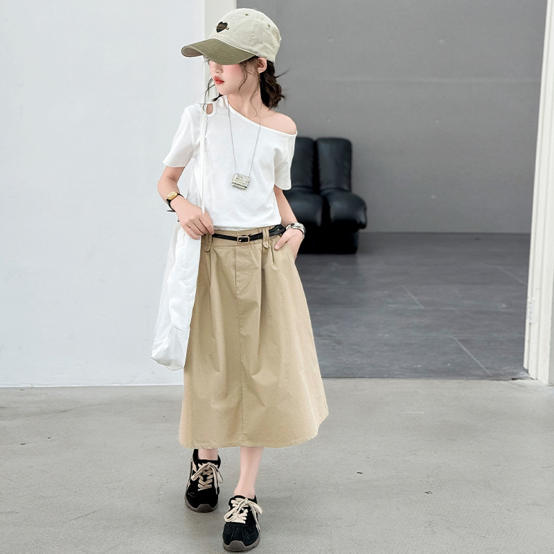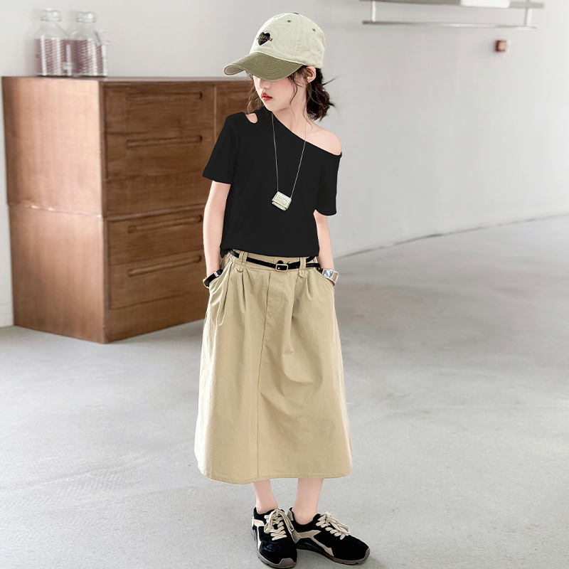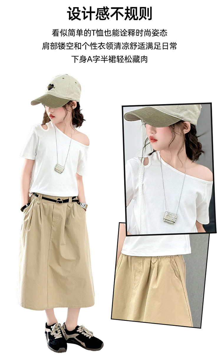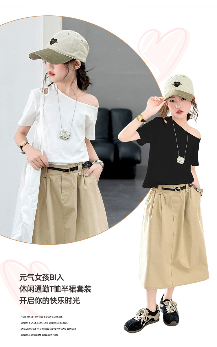 여자 여름 패션 리키 숄더 티셔츠 세트 2025 새로운 간단한 반팔 T 걸스 서양식 스트리트 스커트스토어 가기