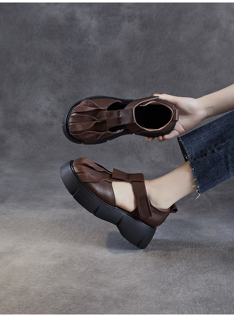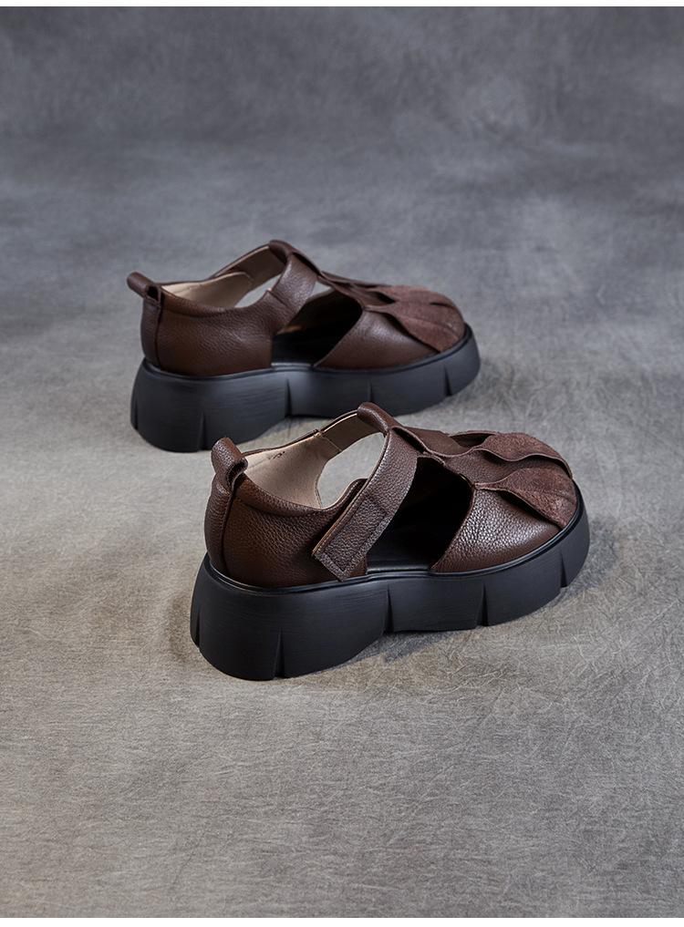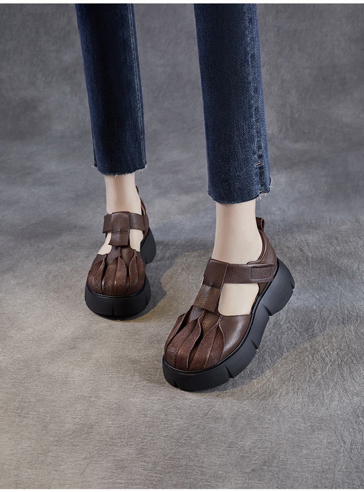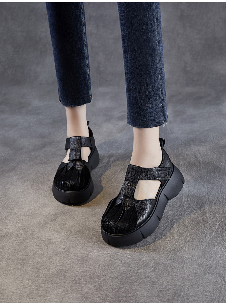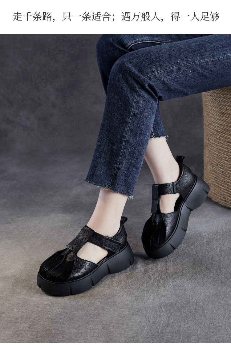 2025 여름 새로운 레트로 여성 신발 민족 스타일 정품 가죽 두꺼운 밑바닥 여성 샌들 T 스트랩 할로우 큰 발가락 신발