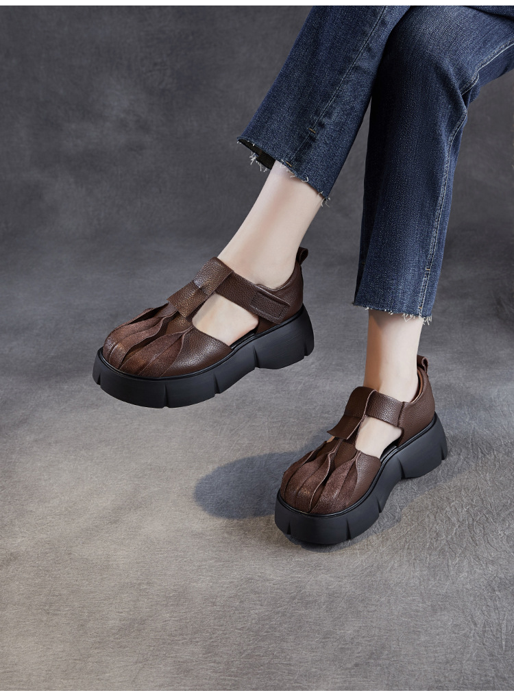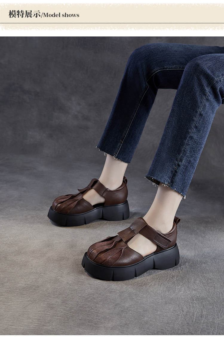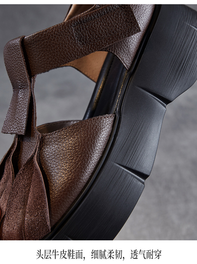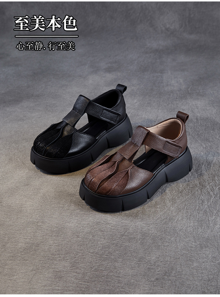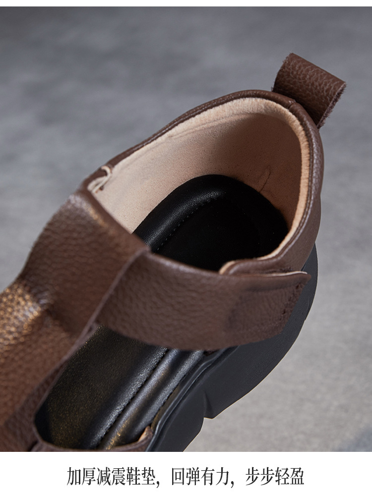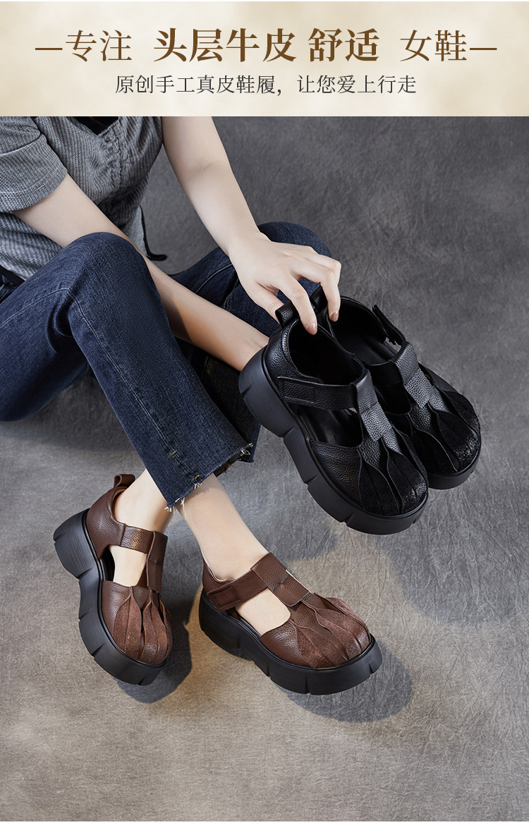 2025 여름 새로운 레트로 여성 신발 민족 스타일 정품 가죽 두꺼운 밑바닥 여성 샌들 T 스트랩 할로우 큰 발가락 신발스토어 가기