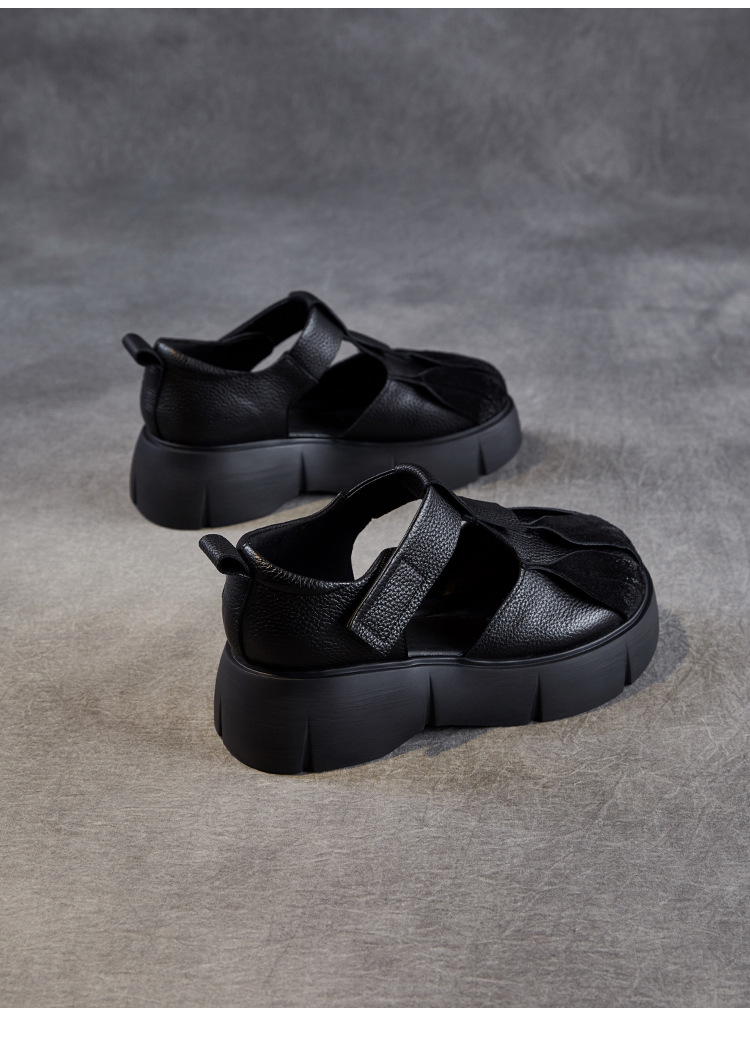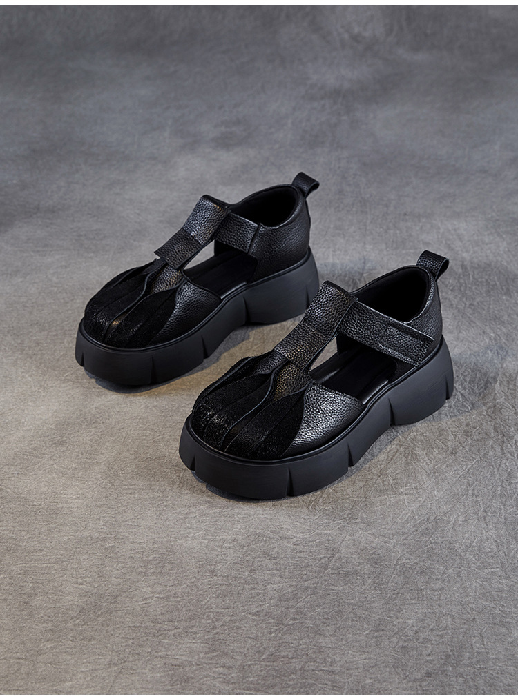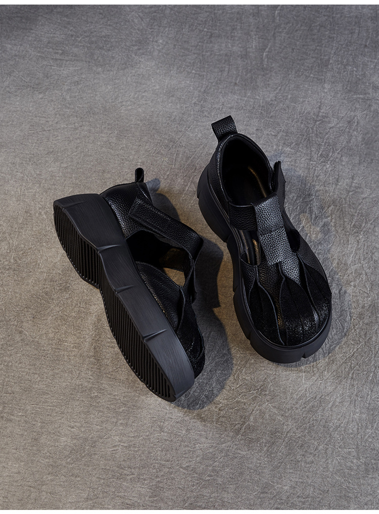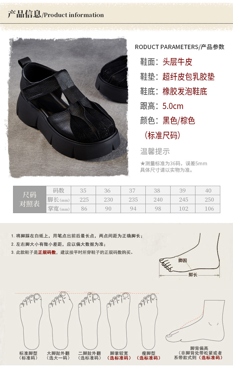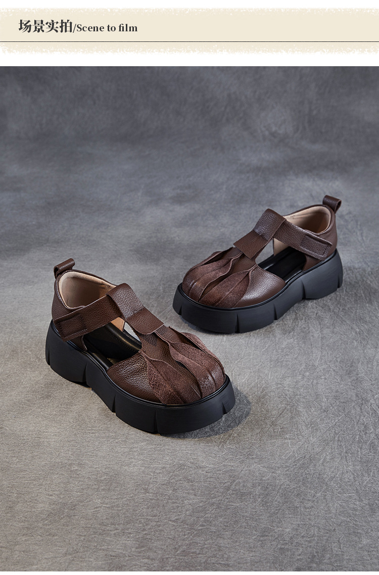 2025 여름 새로운 레트로 여성 신발 민족 스타일 정품 가죽 두꺼운 밑바닥 여성 샌들 T 스트랩 할로우 큰 발가락 신발스토어 가기