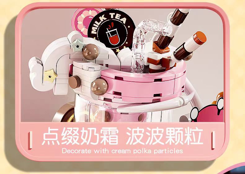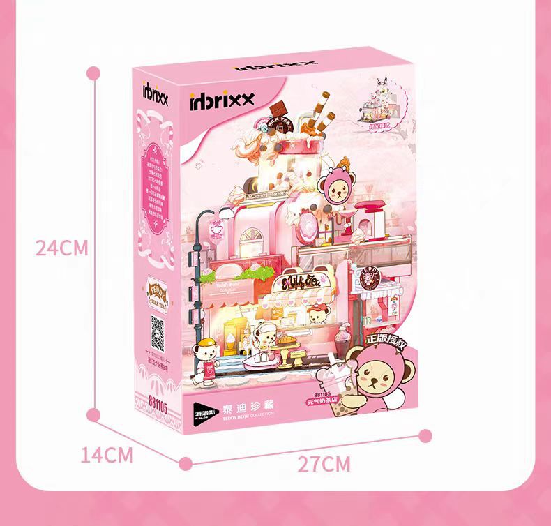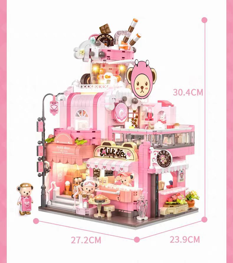 Panlons 881105 테디 베어 바이탈리티 밀크 티 샵 스트리트 뷰 퍼즐 빌딩 블록 조립 데스크탑 장식품 소녀 선물