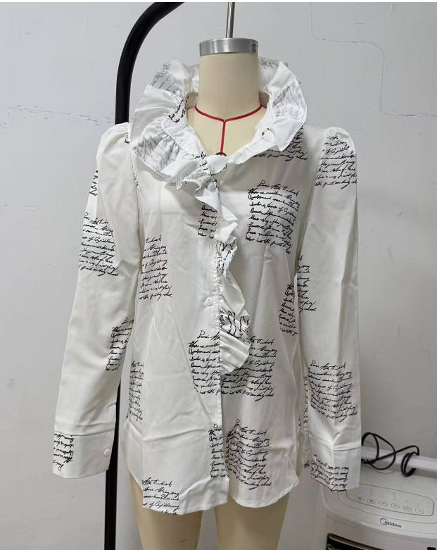 2023 유럽 및 미국 독립 스테이션 AliExpress 국경 간 새로운 추상 인쇄 버블 슬리브 러플 칼라 여성용 셔츠 _