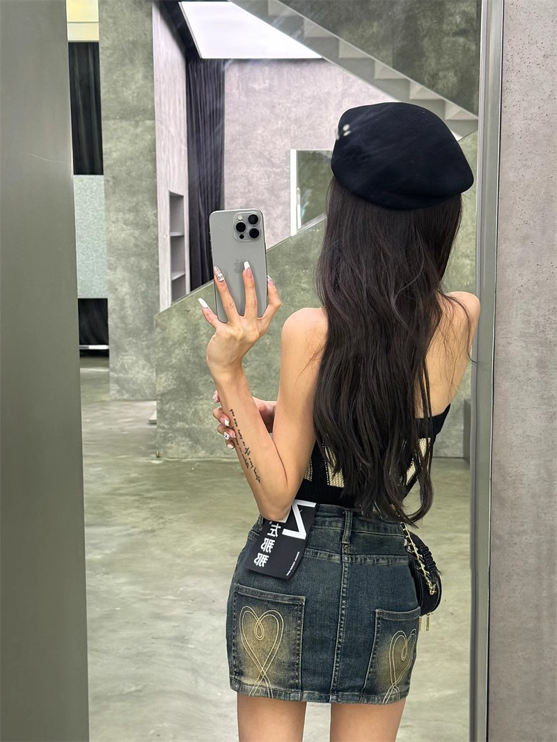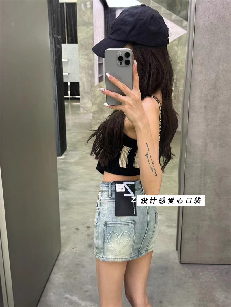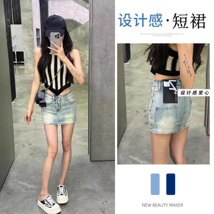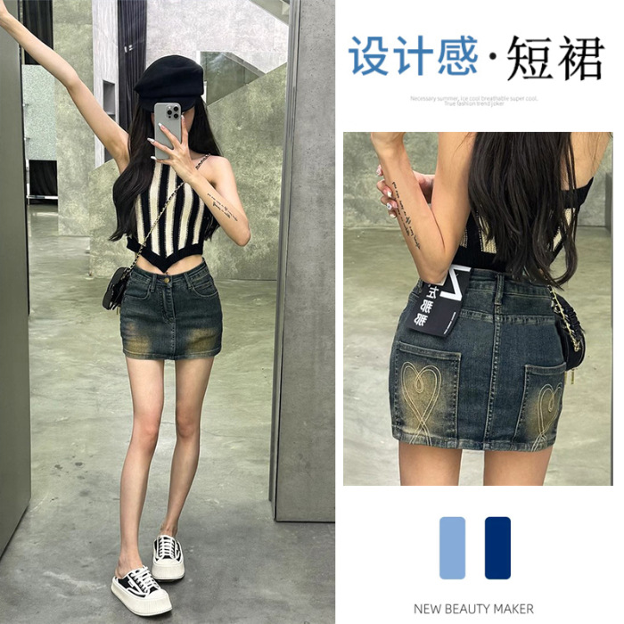 사랑의 주머니 뜨거운 소녀 빈티지 데님 스커트 여성 2024 년 여름 새로운 한국식 하이 웨이스트 A-라인 스커트스토어 가기