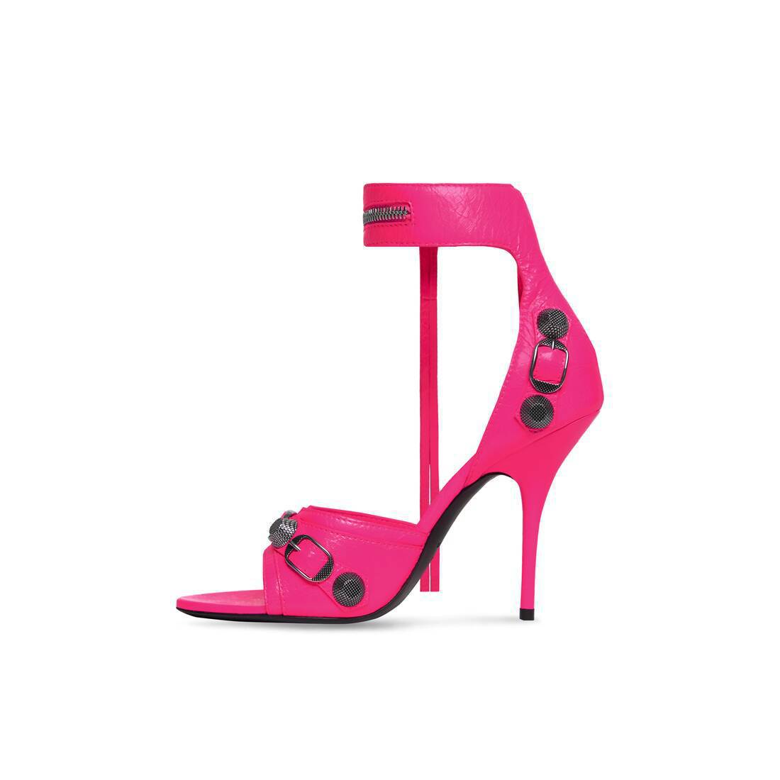 리벳 하이힐 밝은 핑크 형광 컬러 하이힐 샌들 유럽과 미국의 하이힐 제조 업체