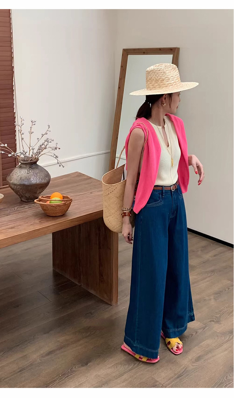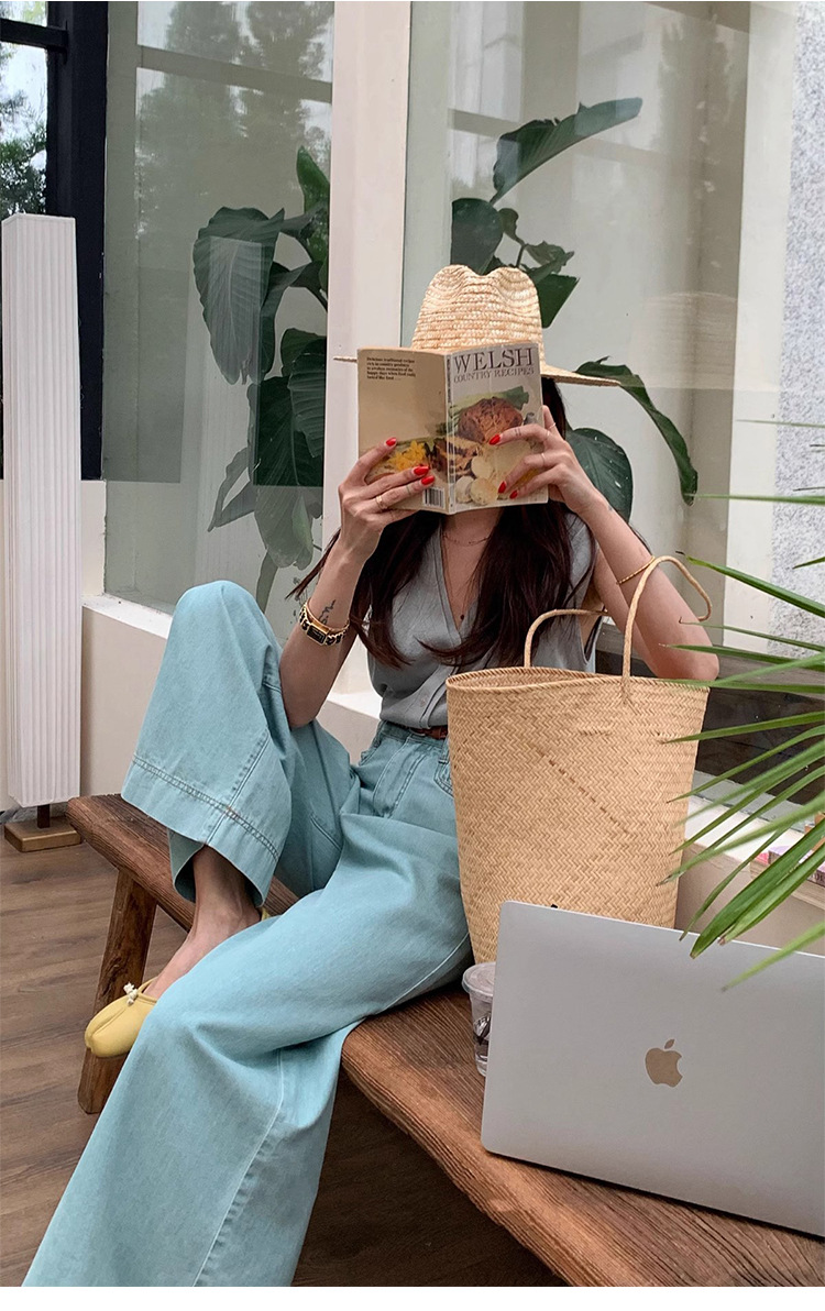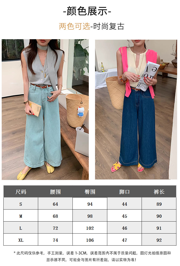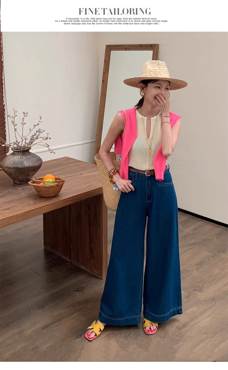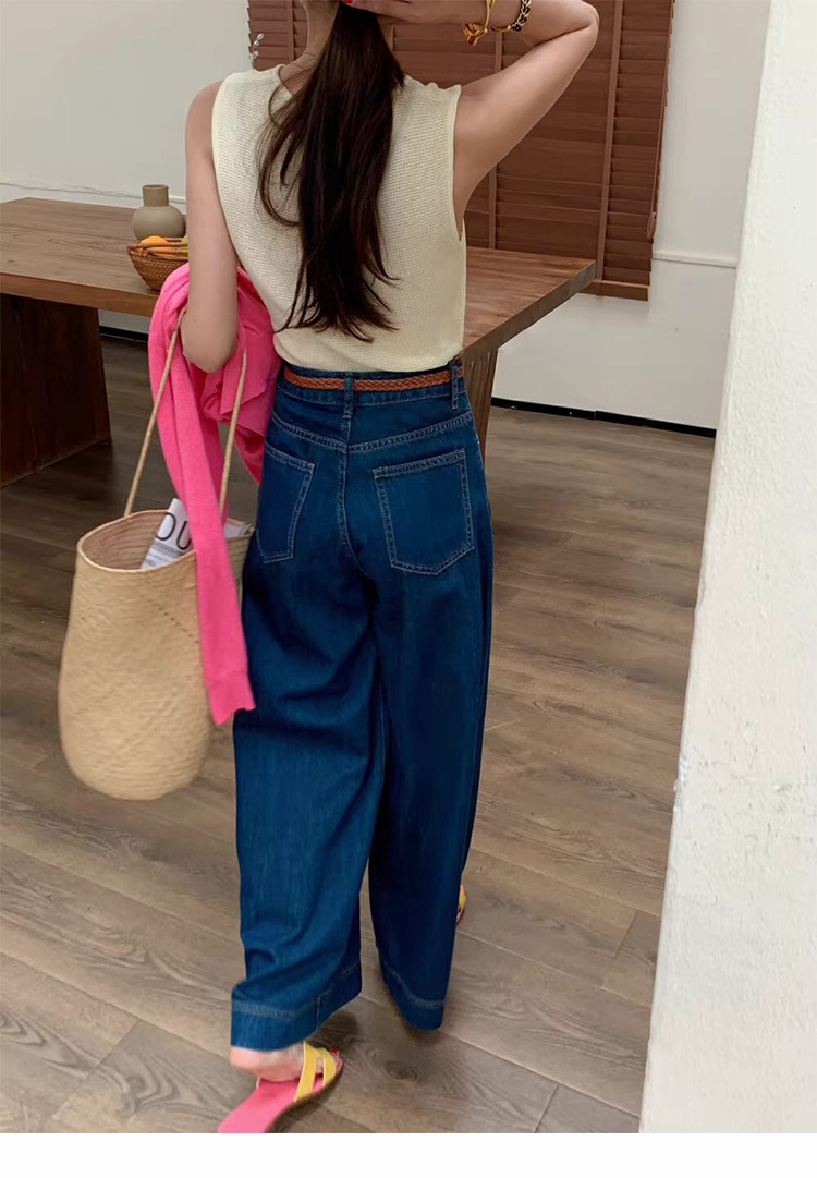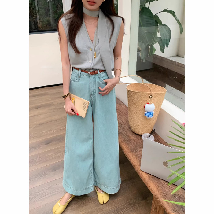 2024 년 여름 새로운 얇은 소재 한국식 하이 웨이스트 심플 올 매치 와이드 레그 청바지 여성용 루즈 슬림 핏 방귀 바지스토어 가기