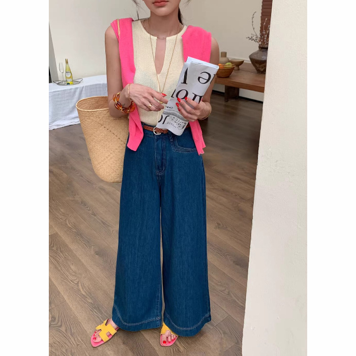 2024 년 여름 새로운 얇은 소재 한국식 하이 웨이스트 심플 올 매치 와이드 레그 청바지 여성용 루즈 슬림 핏 방귀 바지