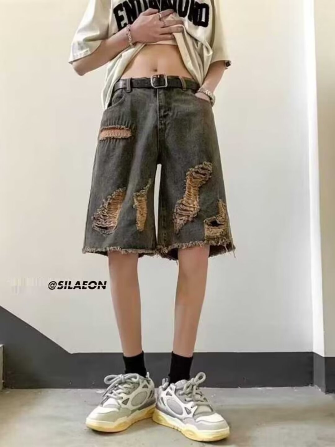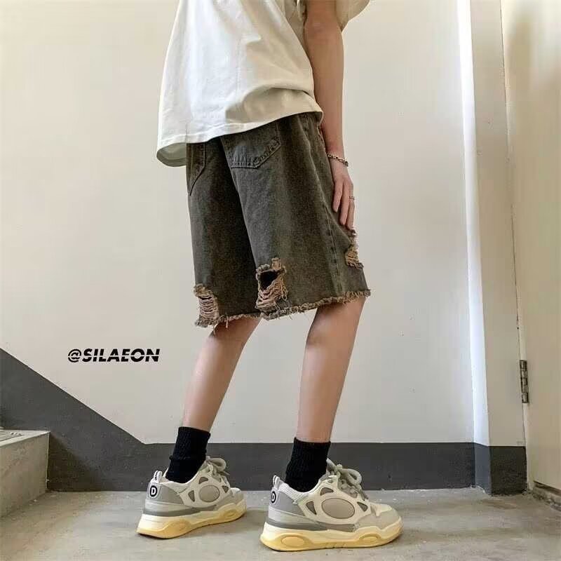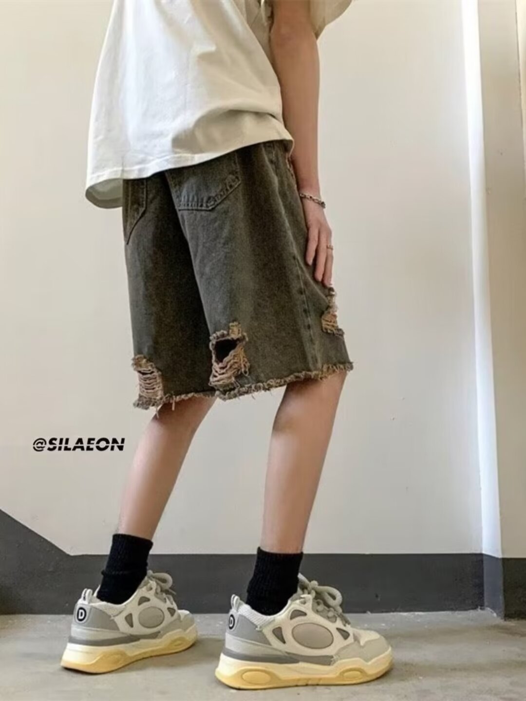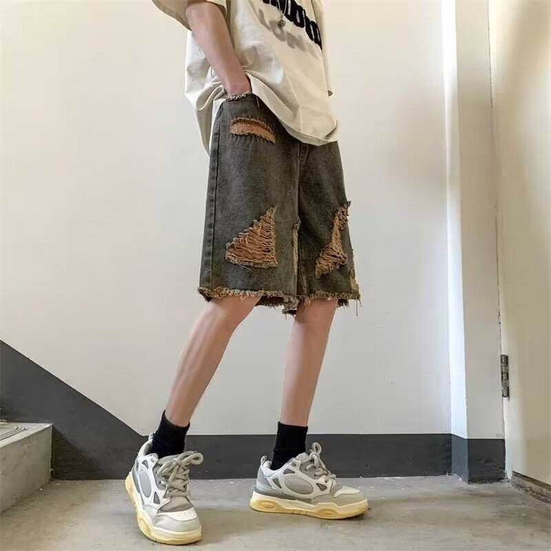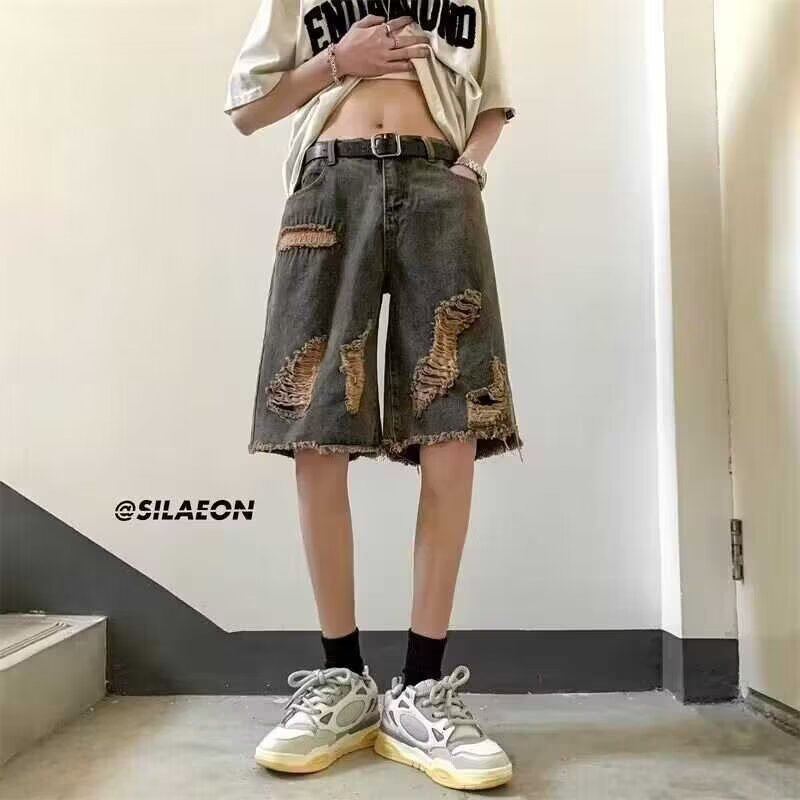 남성용 여름 얇은 5부 데님 반바지 한국 스타일 트렌디 찢어진 슬림 캐주얼 트렌디 브랜드 바지 남성용 5부 바지스토어 가기