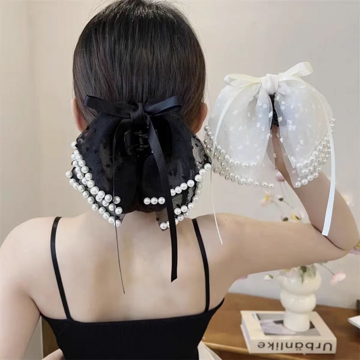 검은색 네잎 클로버 리본 클립, 우아하고 고급스러운 로우 포니테일 머리핀, 머리 뒤쪽 헤어 액세서리스토어 가기