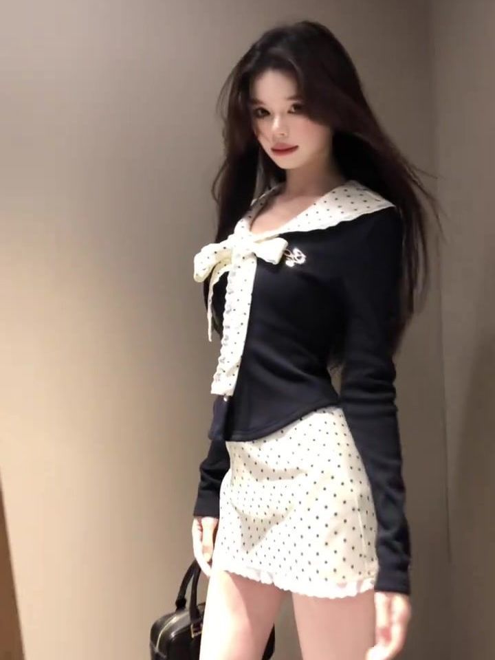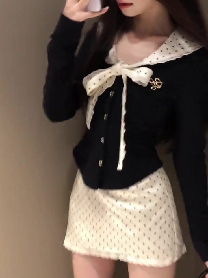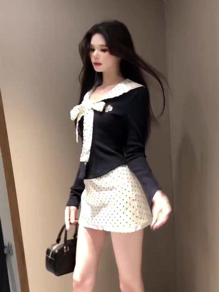 순수한 욕망 스타일 인형 칼라 스트랩 티셔츠 세트 여성의 봄과 가을 높은 허리 웨이브 도트 랩 힙합 스커트 슬림핏 긴 소매 탑스토어 가기