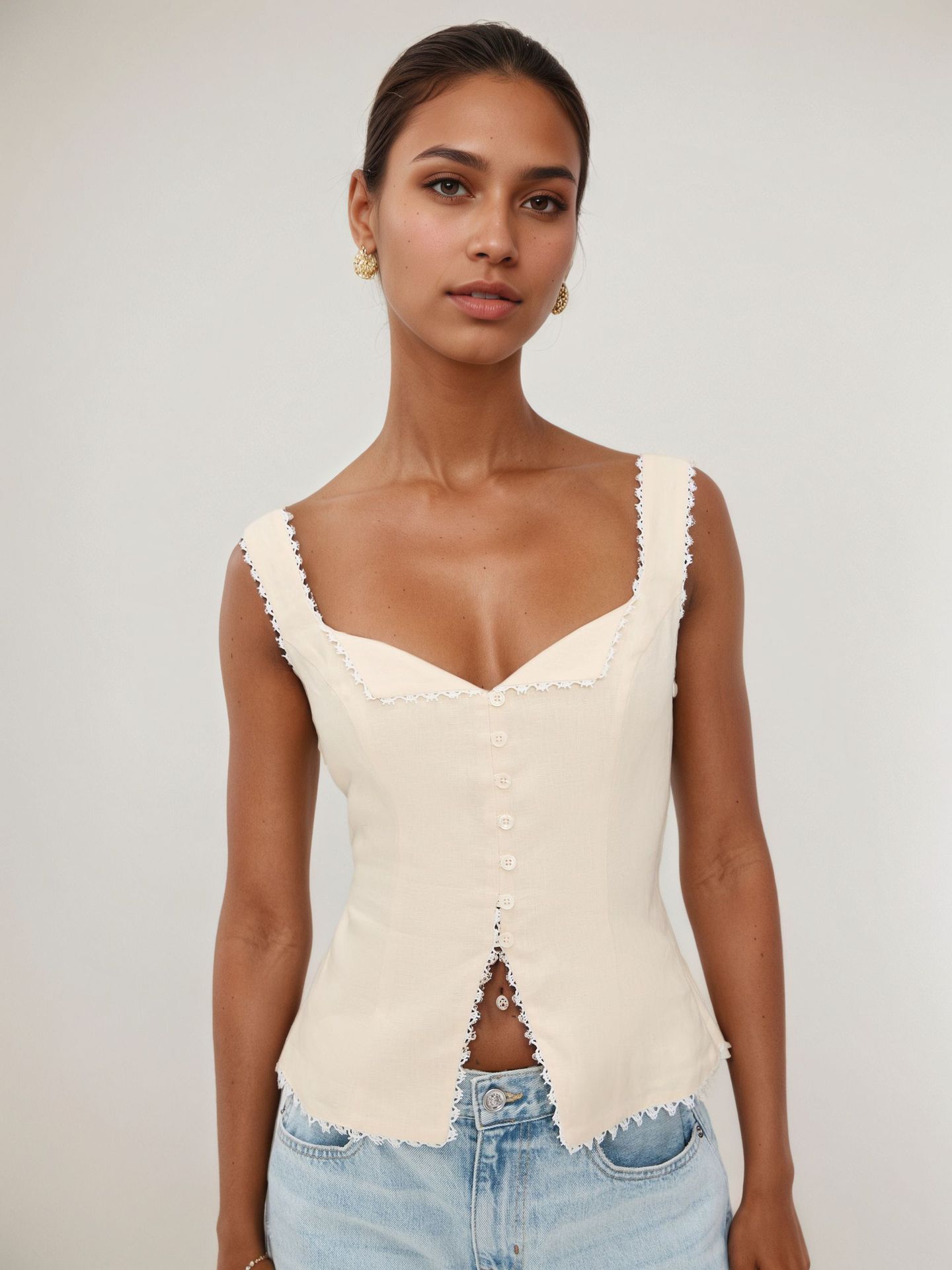 유럽과 미국 스타일의 여성 의류 프랑스 빈티지 코튼 및 리넨 레이스 바느질 패션 가슴 슬링 솔리드 컬러 민소매 조끼 탑