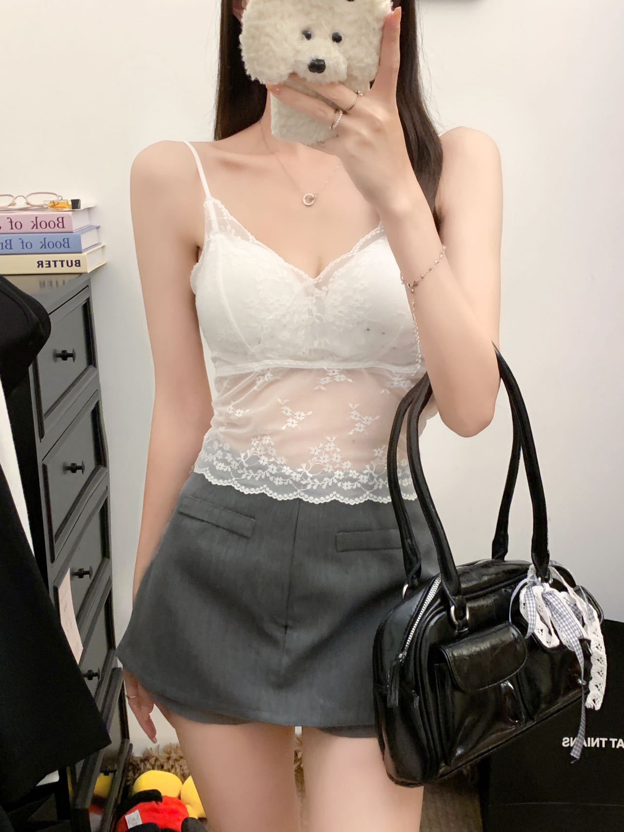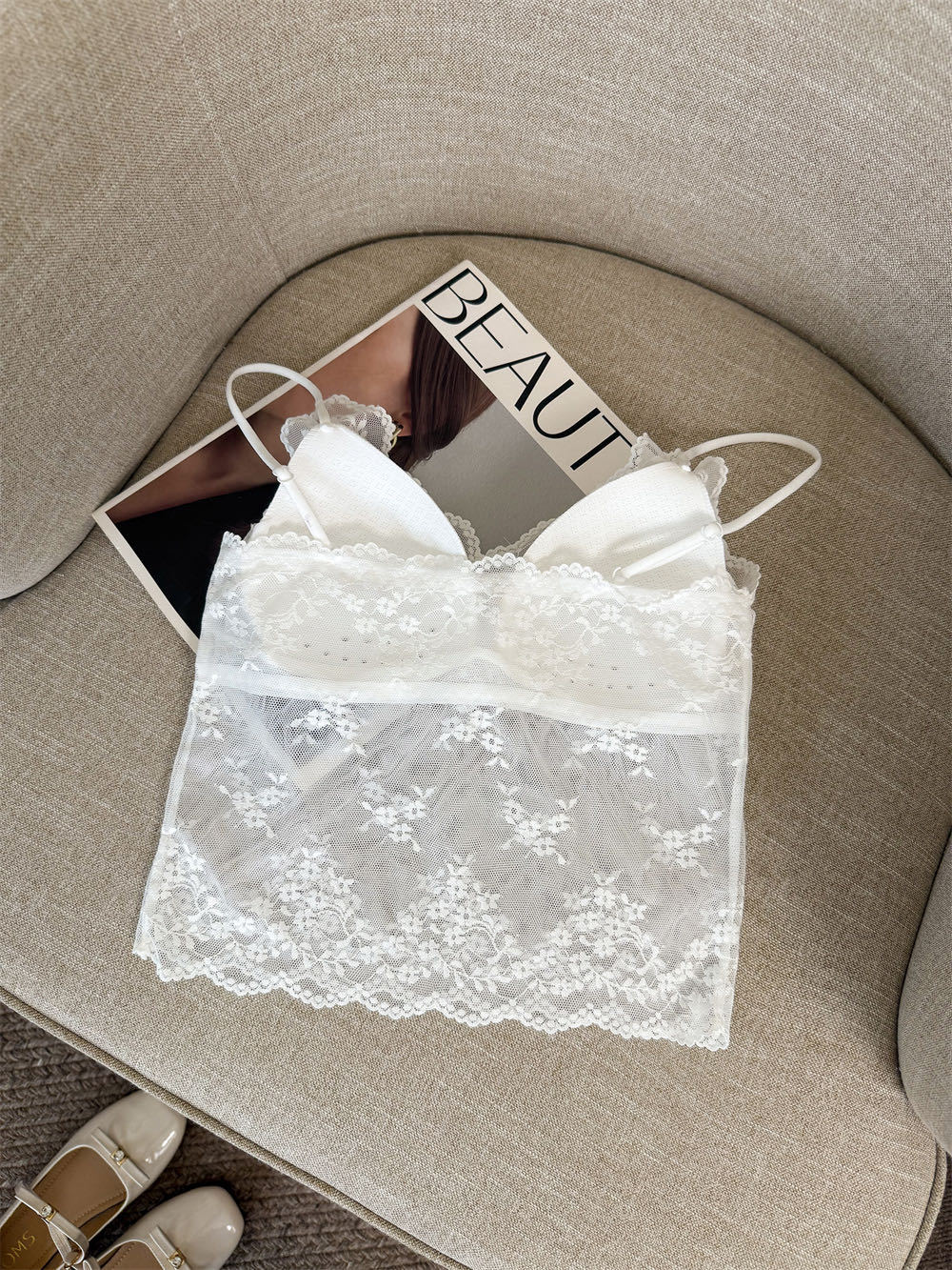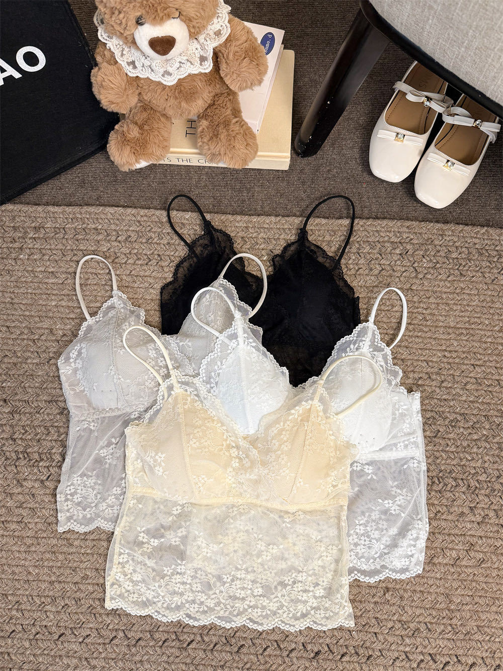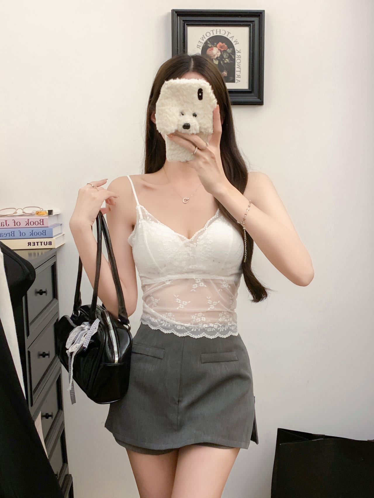 6250 # 브이넥 섹시 할로우 서스펜더 2025 봄 여름 신작 순수한 욕망 스타일 한국 디자인 레이스 가슴 패드 포함