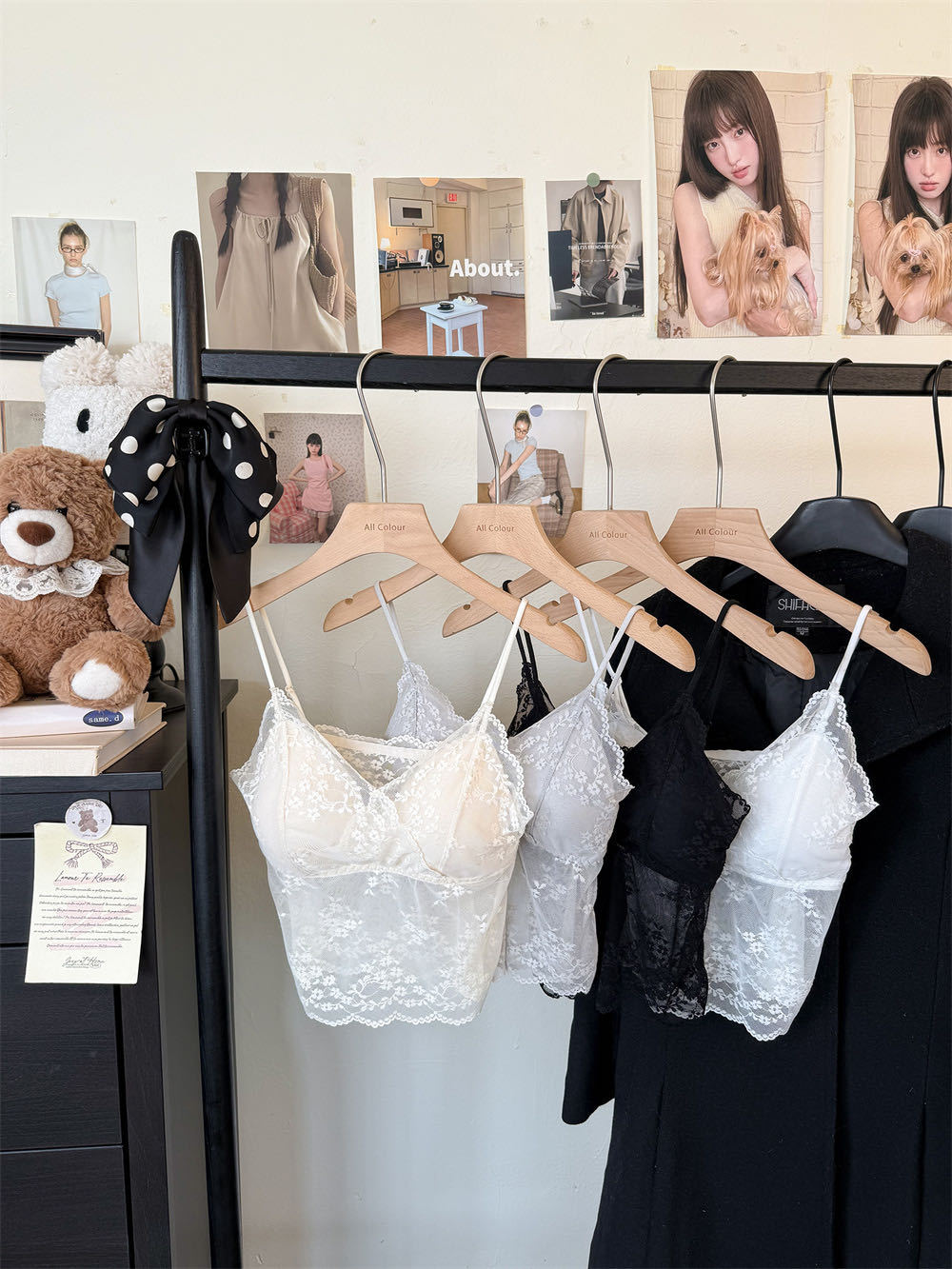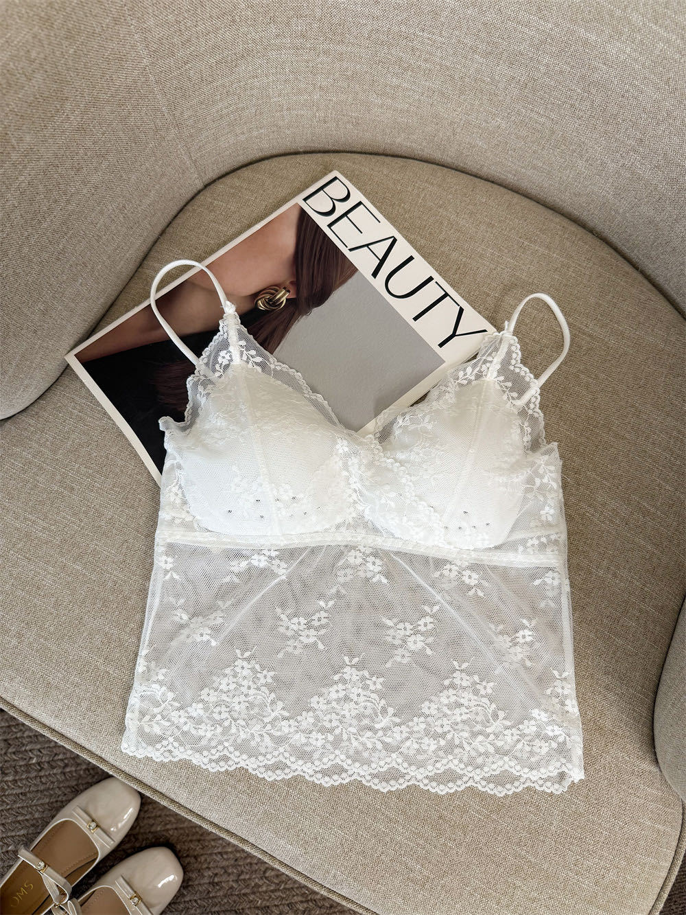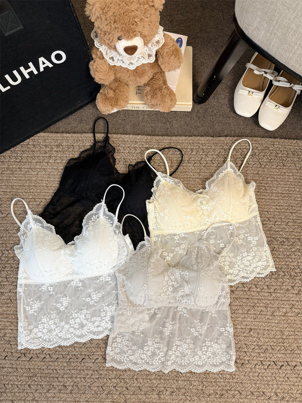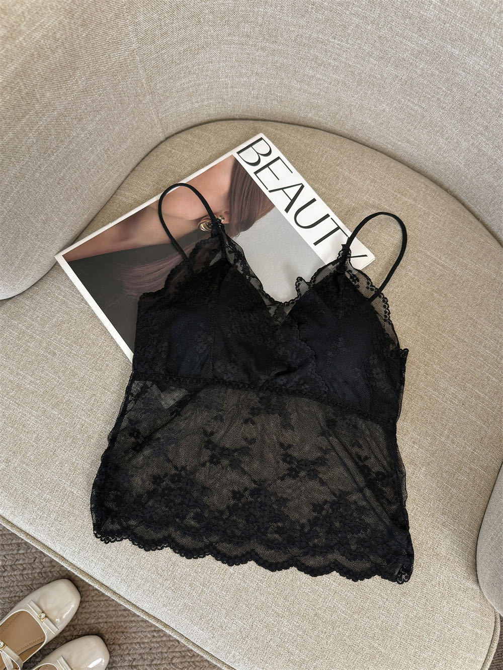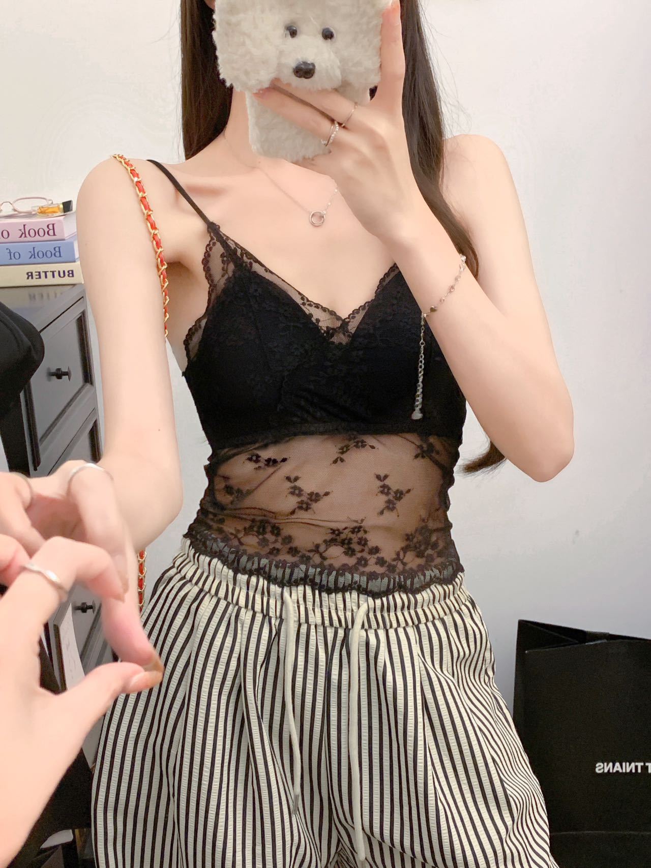 6250 # 브이넥 섹시 할로우 서스펜더 2025 봄 여름 신작 순수한 욕망 스타일 한국 디자인 레이스 가슴 패드 포함스토어 가기