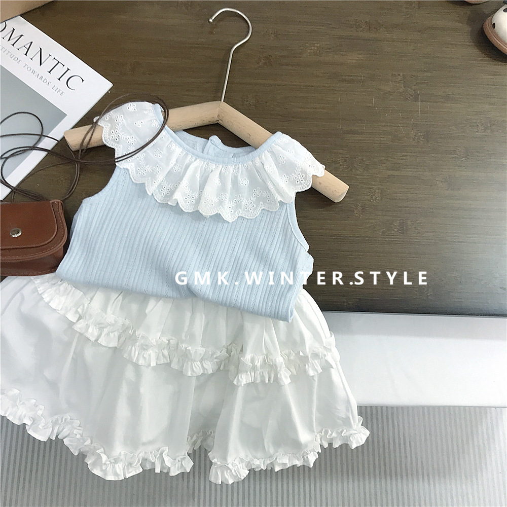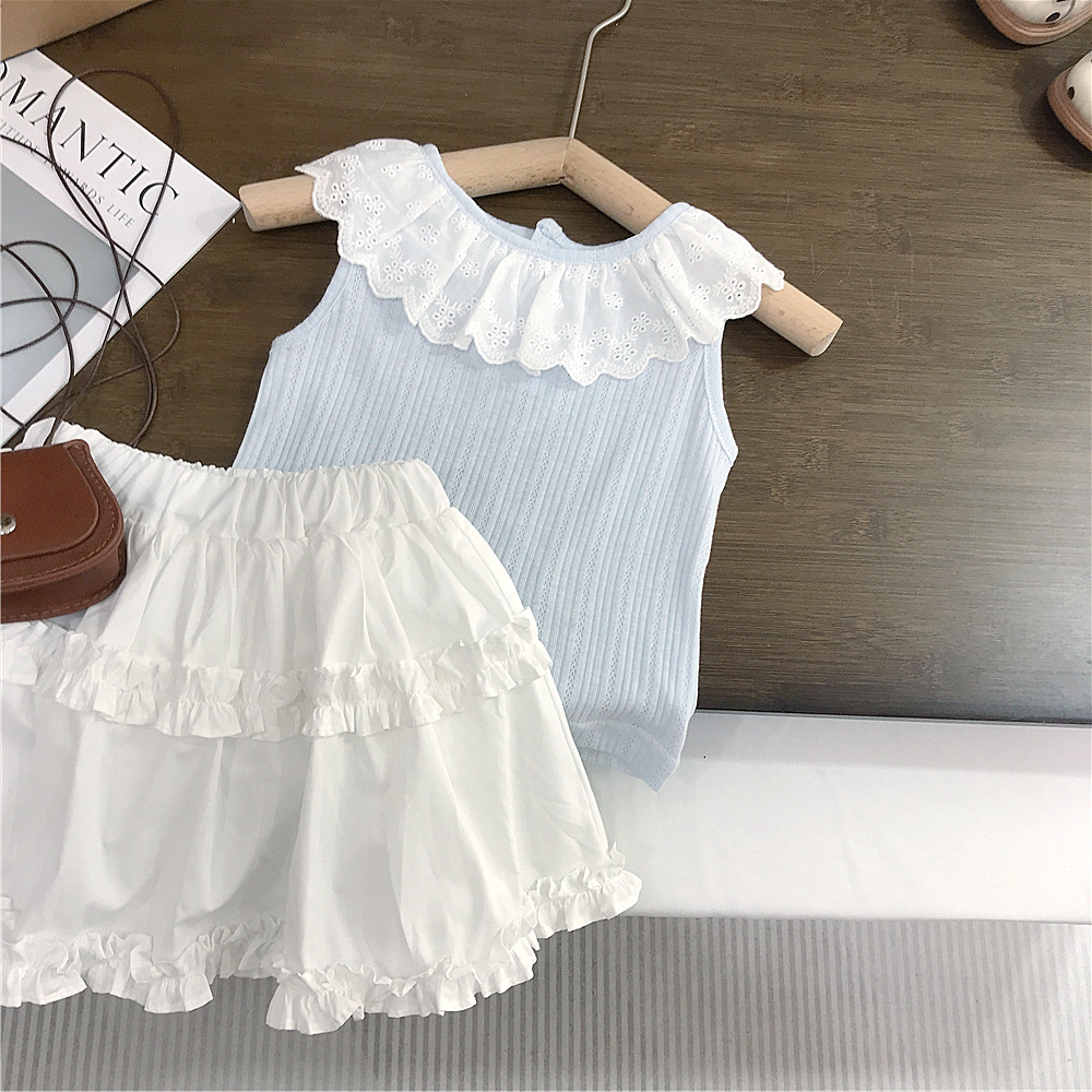 어린이 민소매 레이스 인형 칼라 베이스 셔츠 여름 얇은 한국식 어린이 의류 아기 옷 여아 스커트 세트