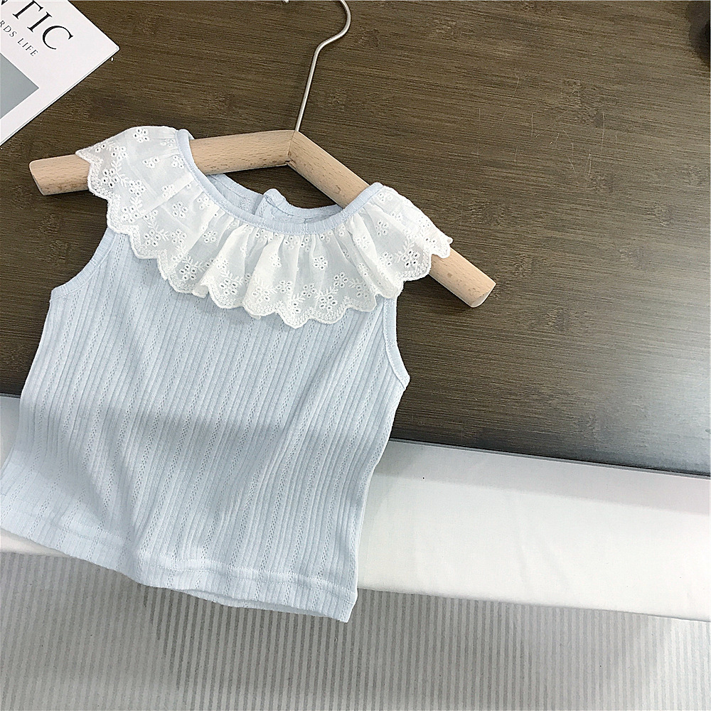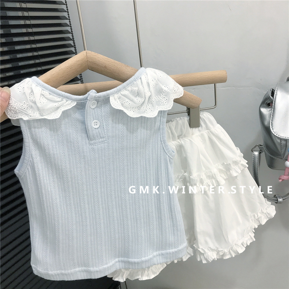 어린이 민소매 레이스 인형 칼라 베이스 셔츠 여름 얇은 한국식 어린이 의류 아기 옷 여아 스커트 세트스토어 가기