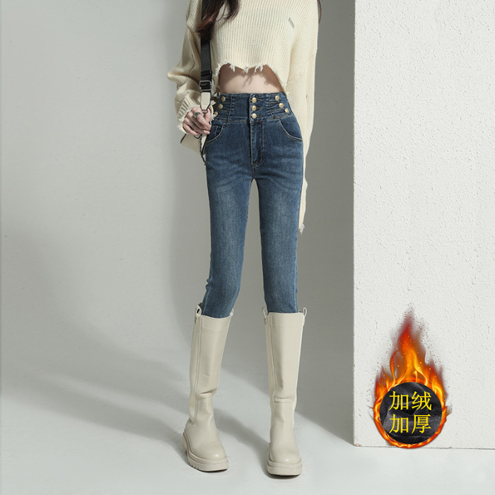 검은 청바지 여성용 스키니 팬츠 2023 새로운 봄과 가을 높은 허리 슬리밍 겨울 스트레치 기모 바지