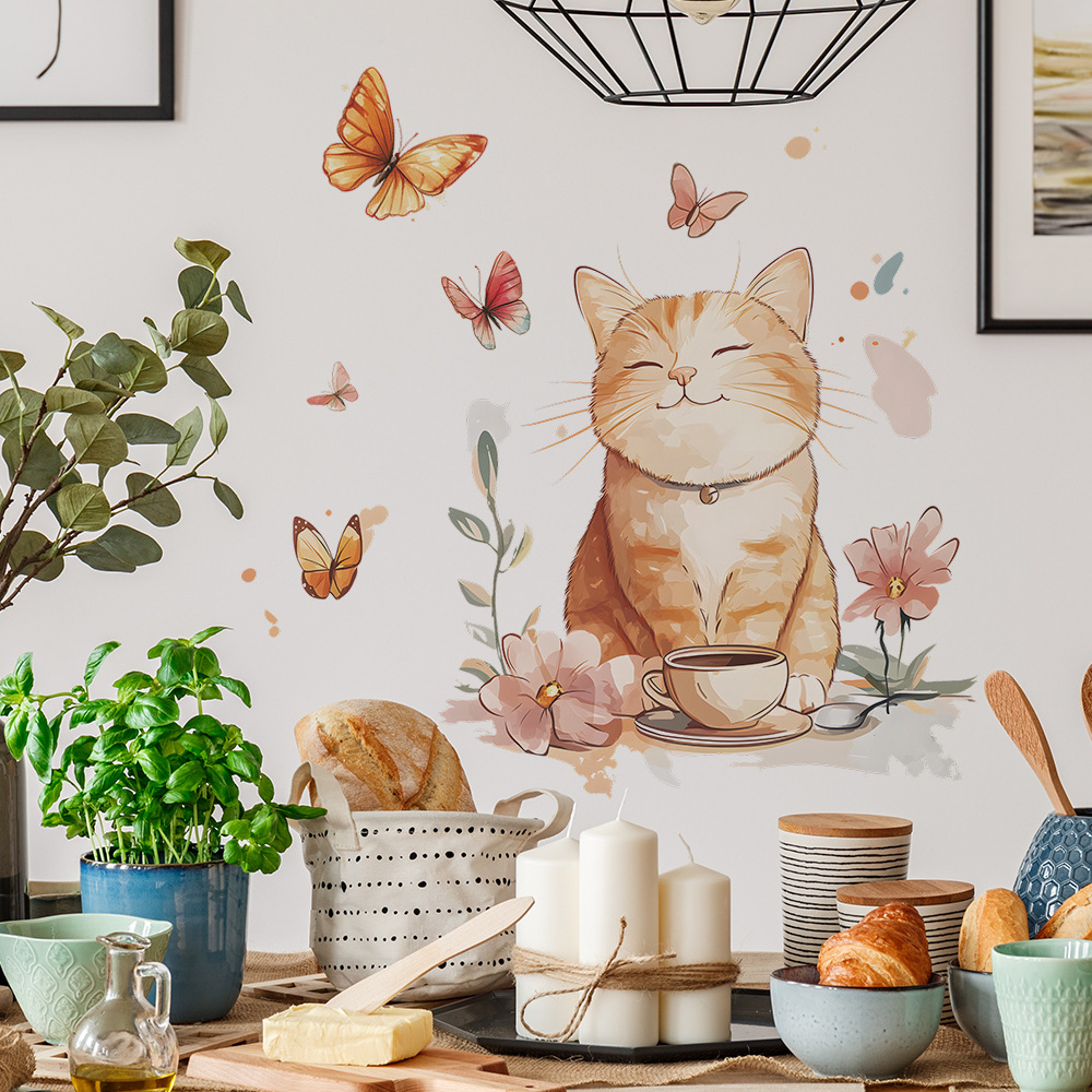Fun-f607 통통한 오렌지 고양이 나비 주방 레스토랑 홈 벽 배경 미화 장식 벽 스티커 국경 간