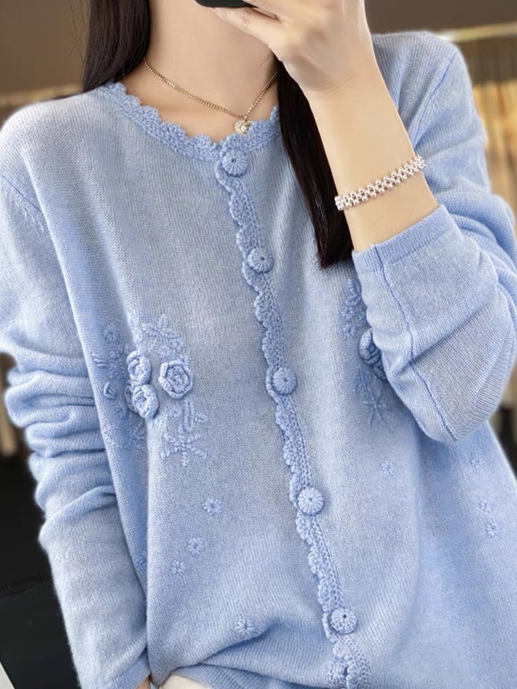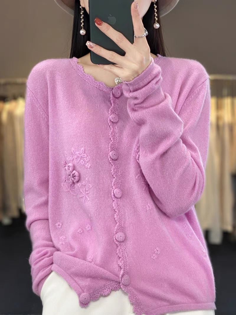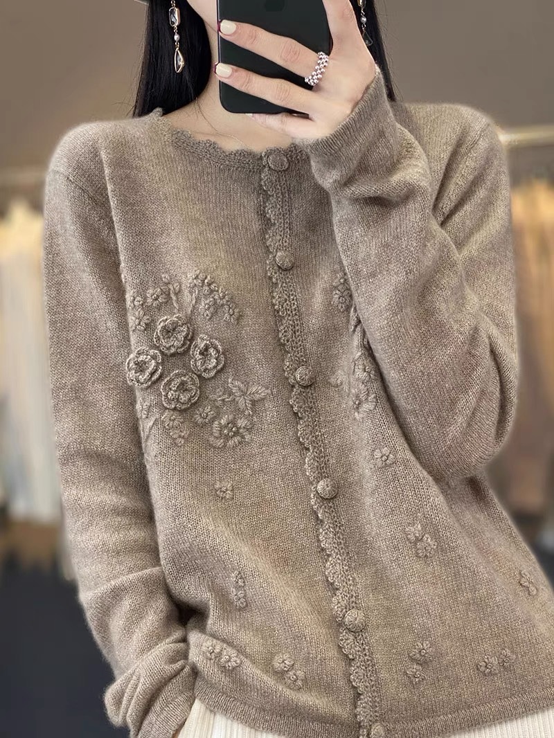 니트 카디건 여성 라운드 넥 착용 가을 및 겨울 중공업 스웨터 휴대용 로즈 니트 재킷