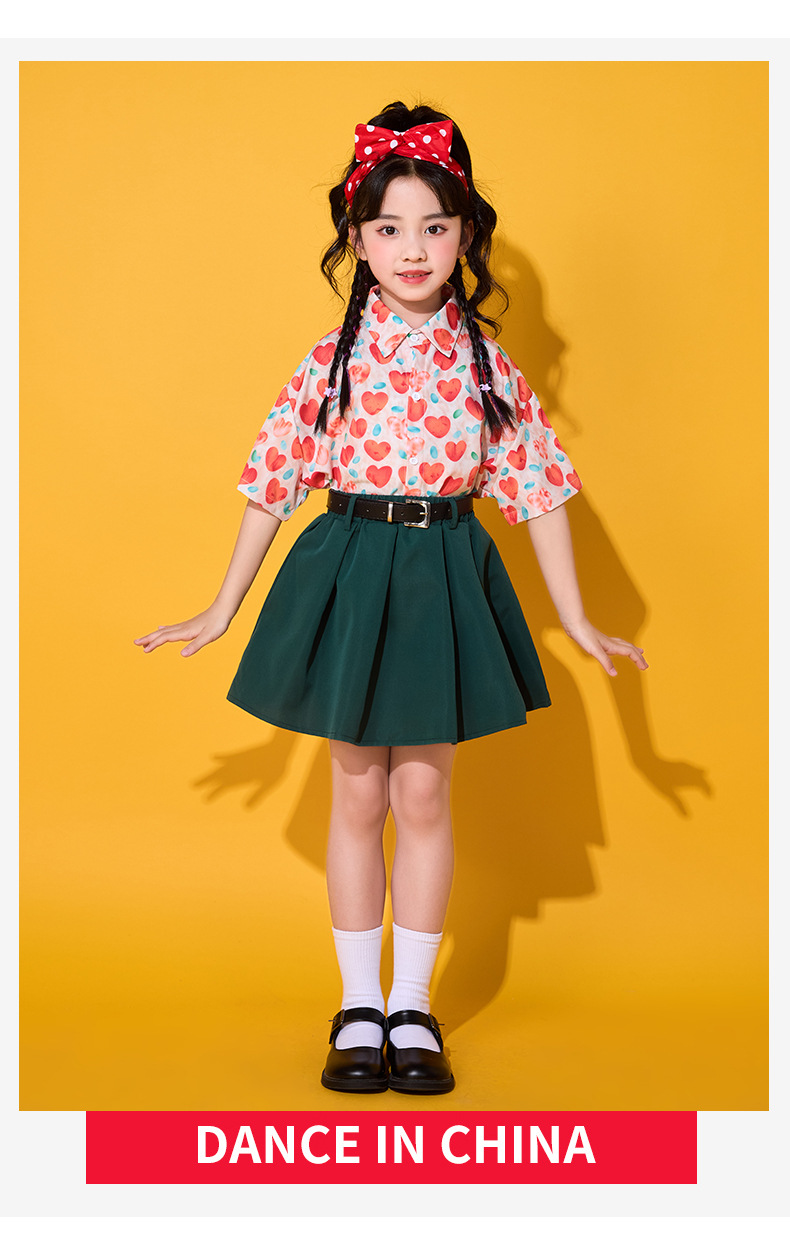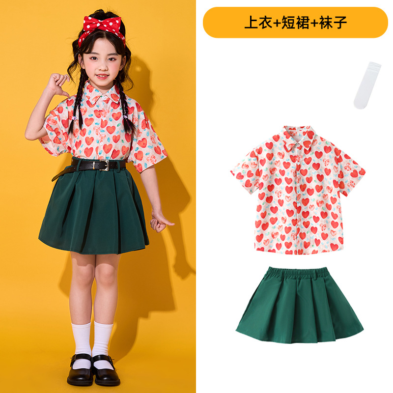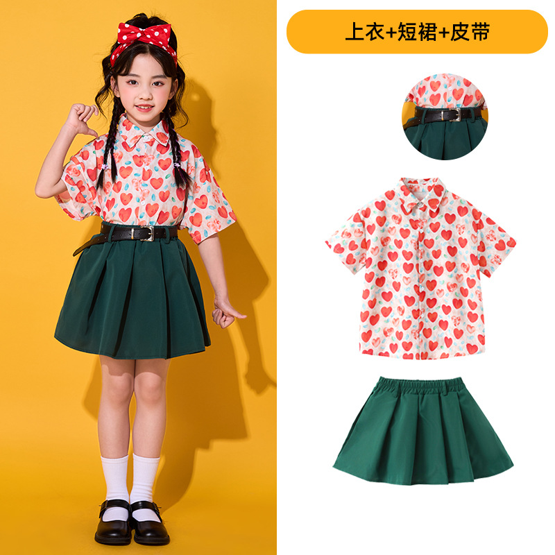 • 레드 하트 셔츠 + 짙은 녹색 스커트 + 벨트 + 순백색 양말
