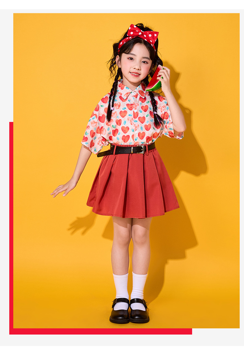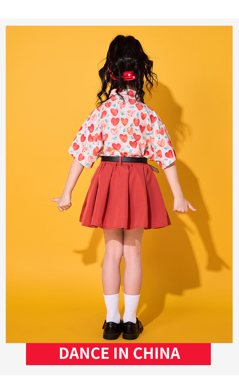 • 레드 하트 셔츠 + 레드 스커트 + 벨트