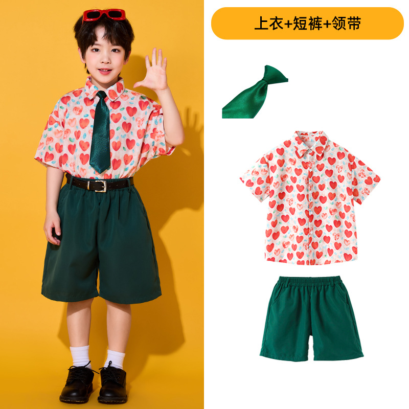 • 레드 하트 셔츠 + 짙은 녹색 바지 + 짙은 녹색 넥타이