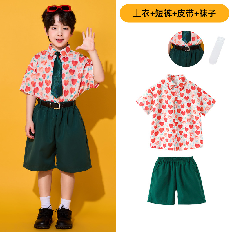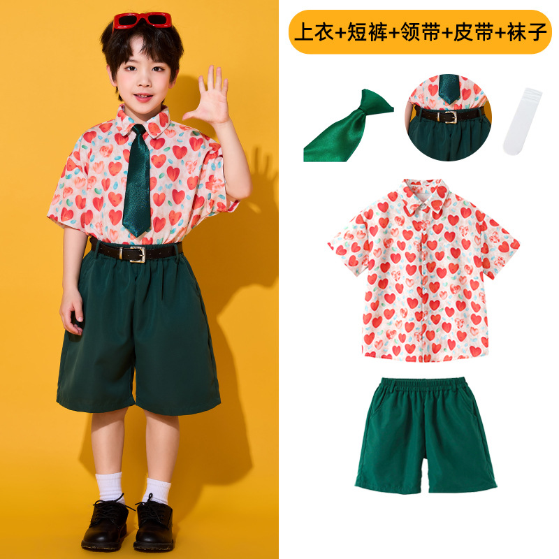 • 레드 하트 셔츠 + 짙은 녹색 바지 + 벨트 + 순백색 양말 + 짙은 녹색 넥타이