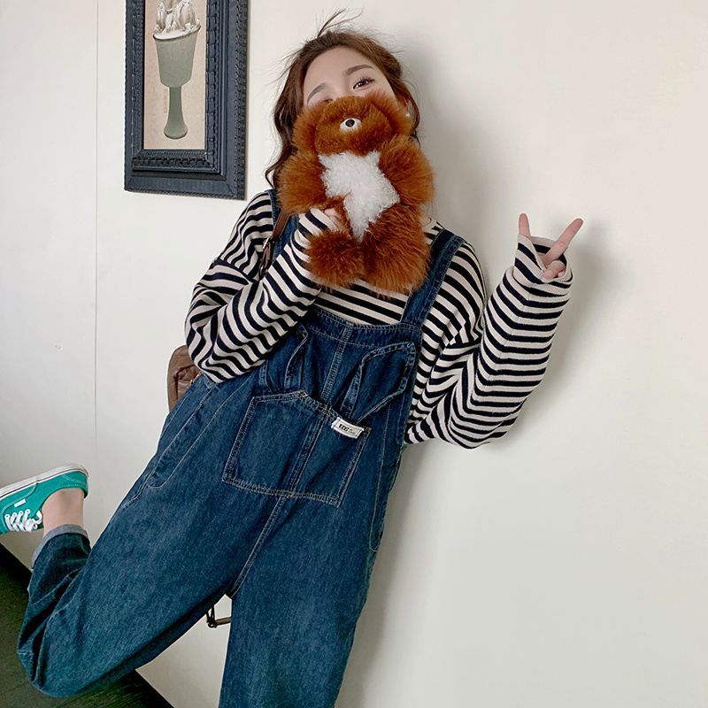 리얼 샷 데님 스트랩 팬츠 여성용 봄과 가을 루즈 슬리밍 스트랩 스트레이트 팬츠 스트라이프 티셔츠 투피스 세트스토어 가기