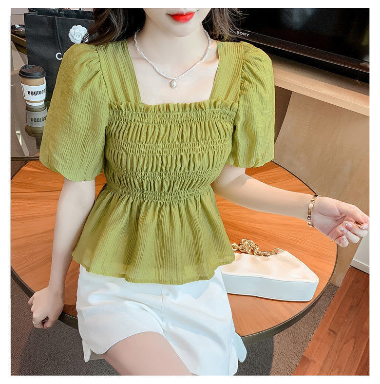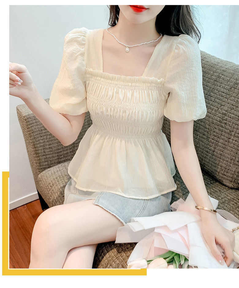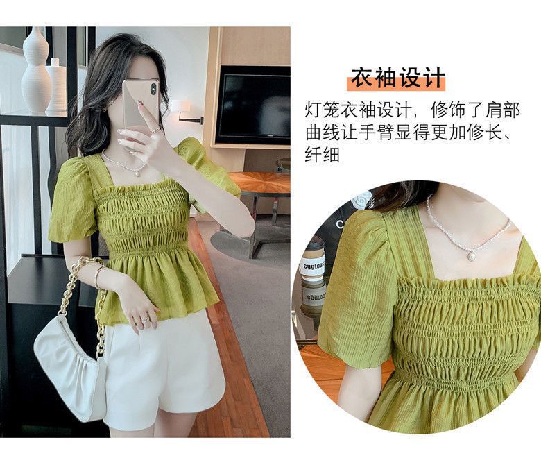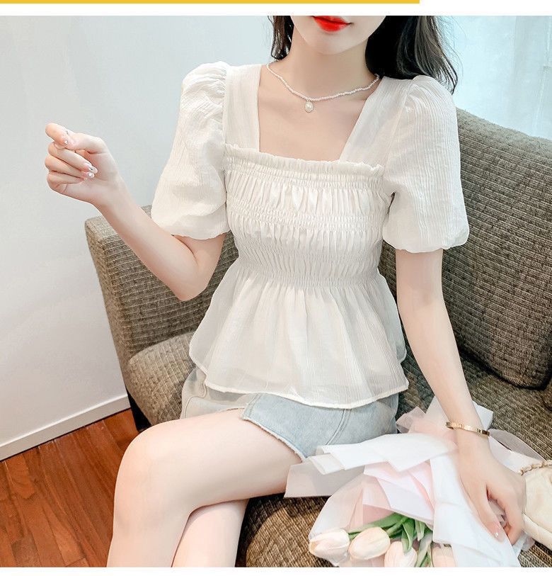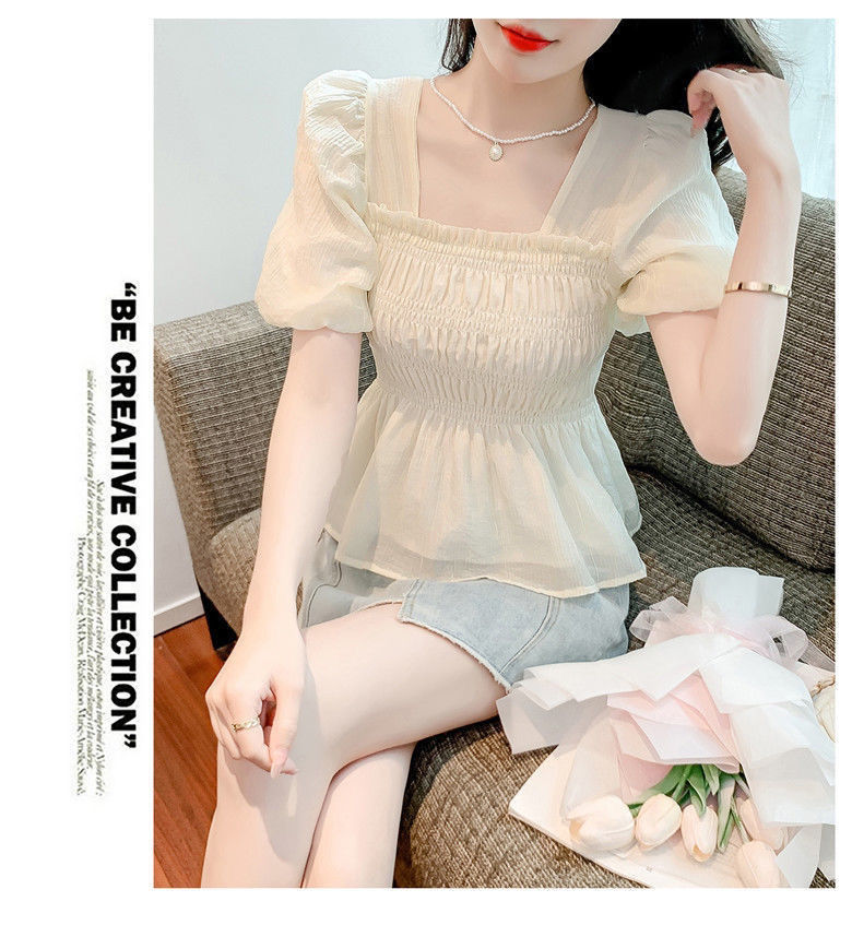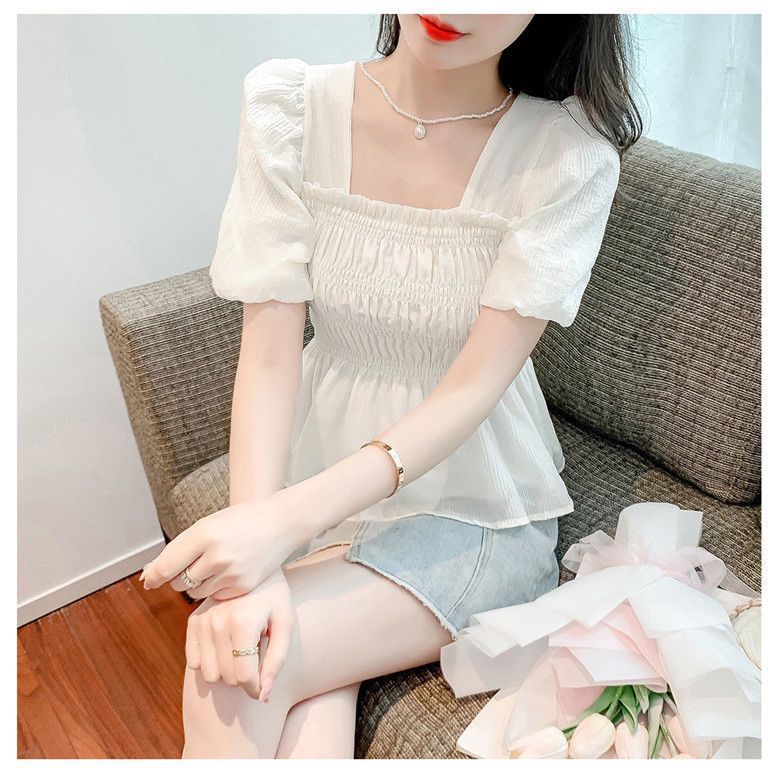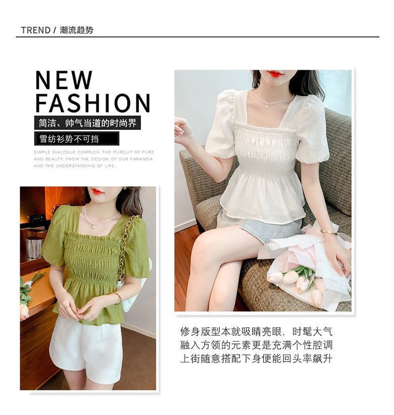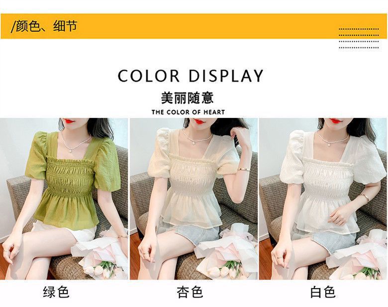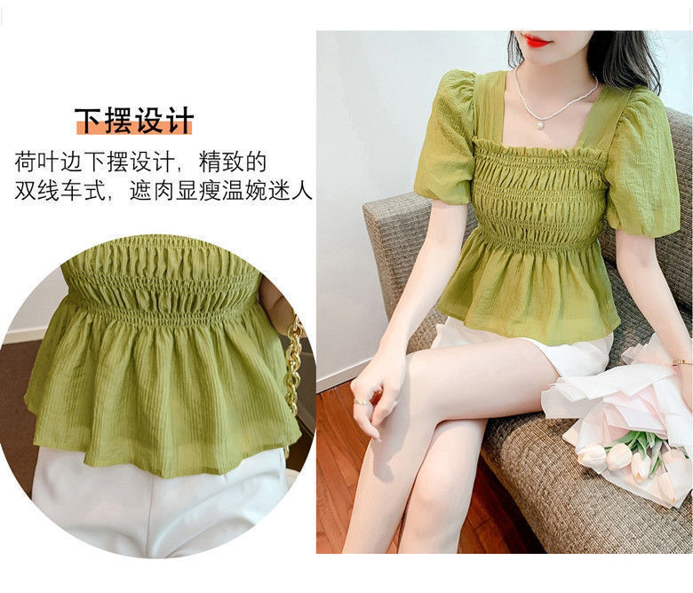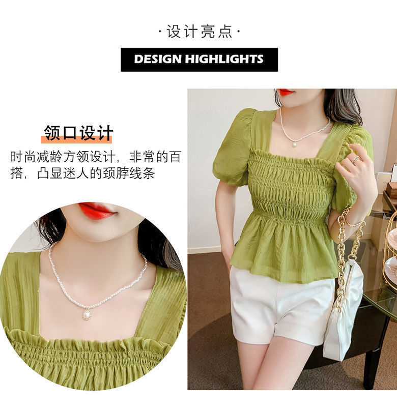 2023 새로운 여름 스타일 쉬폰 프렌치 스퀘어 넥 랜턴 슬리브 달콤하고 귀여운 틈새 반팔 탑 슬림 허리 탑 여성용스토어 가기