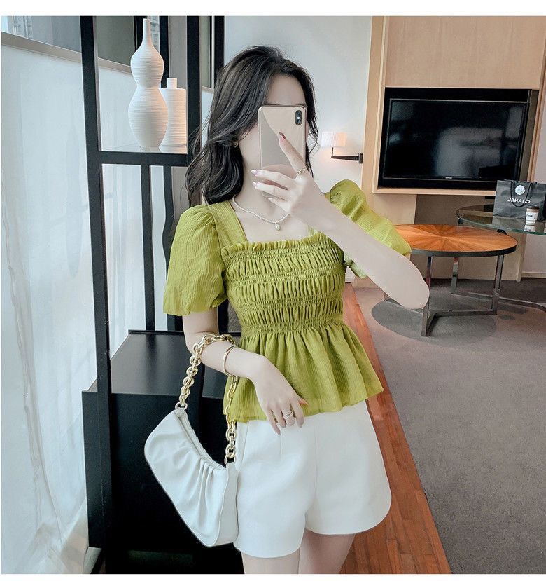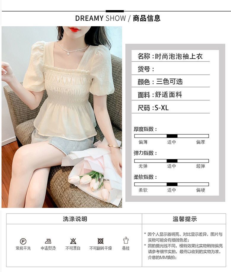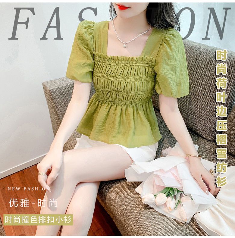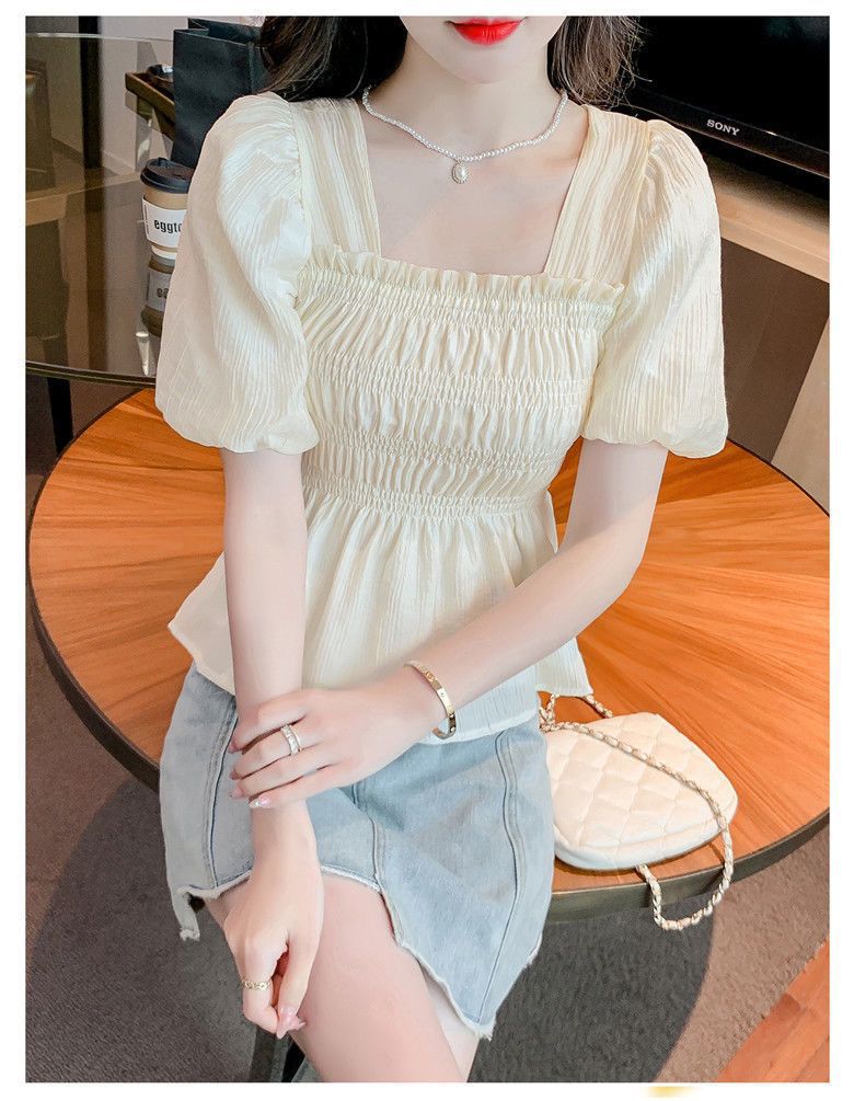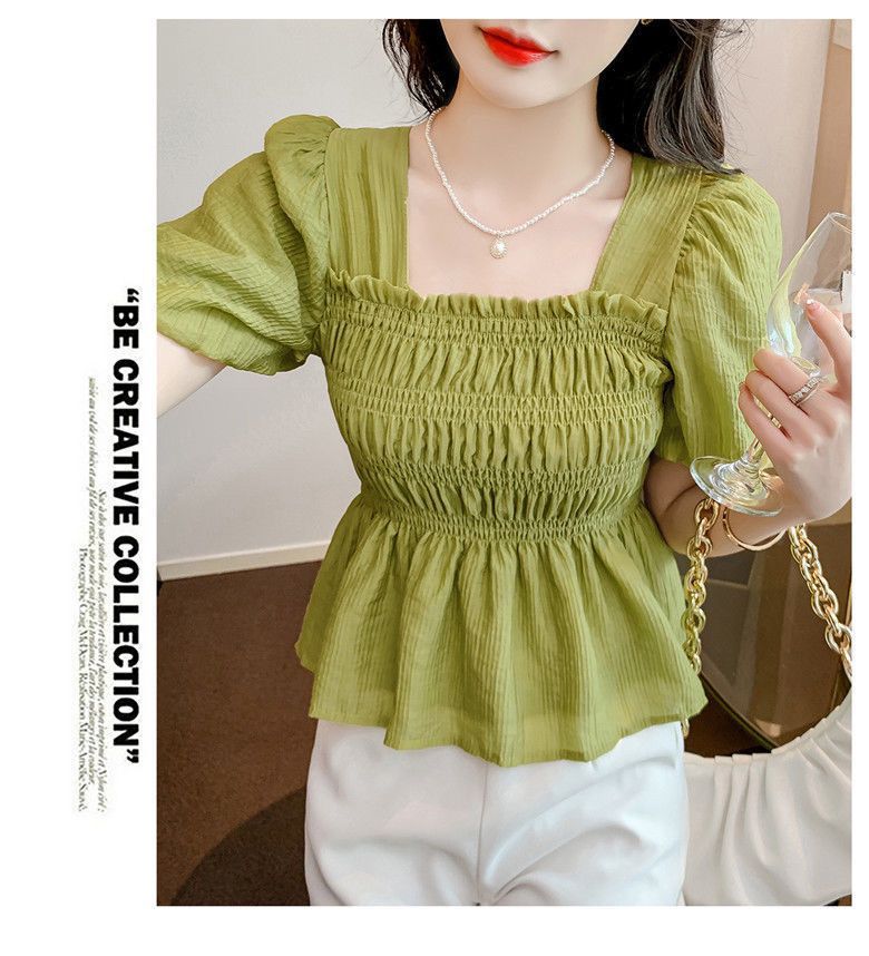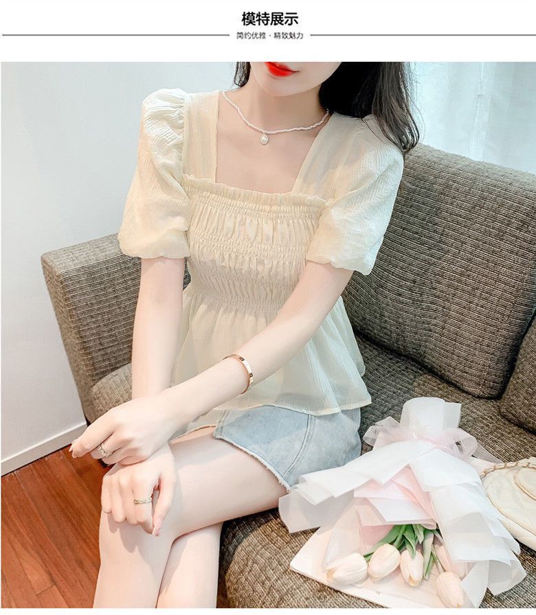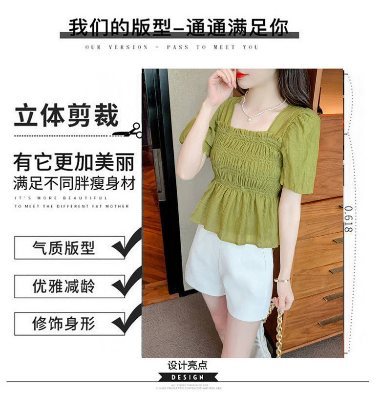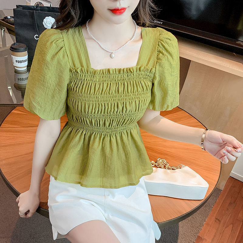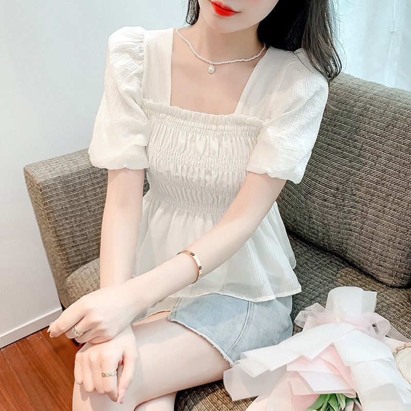 2023 새로운 여름 스타일 쉬폰 프렌치 스퀘어 넥 랜턴 슬리브 달콤하고 귀여운 틈새 반팔 탑 슬림 허리 탑 여성용스토어 가기