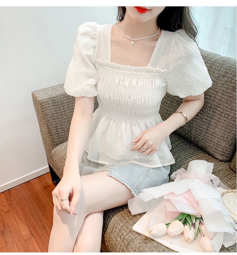 2023 새로운 여름 스타일 쉬폰 프렌치 스퀘어 넥 랜턴 슬리브 달콤하고 귀여운 틈새 반팔 탑 슬림 허리 탑 여성용