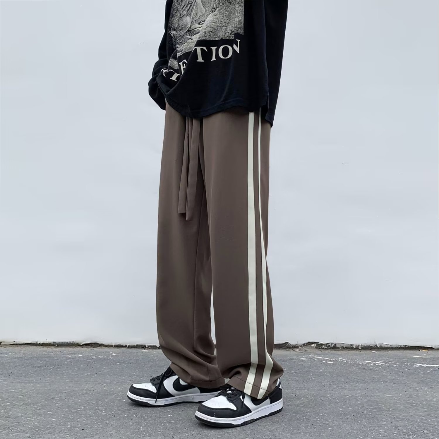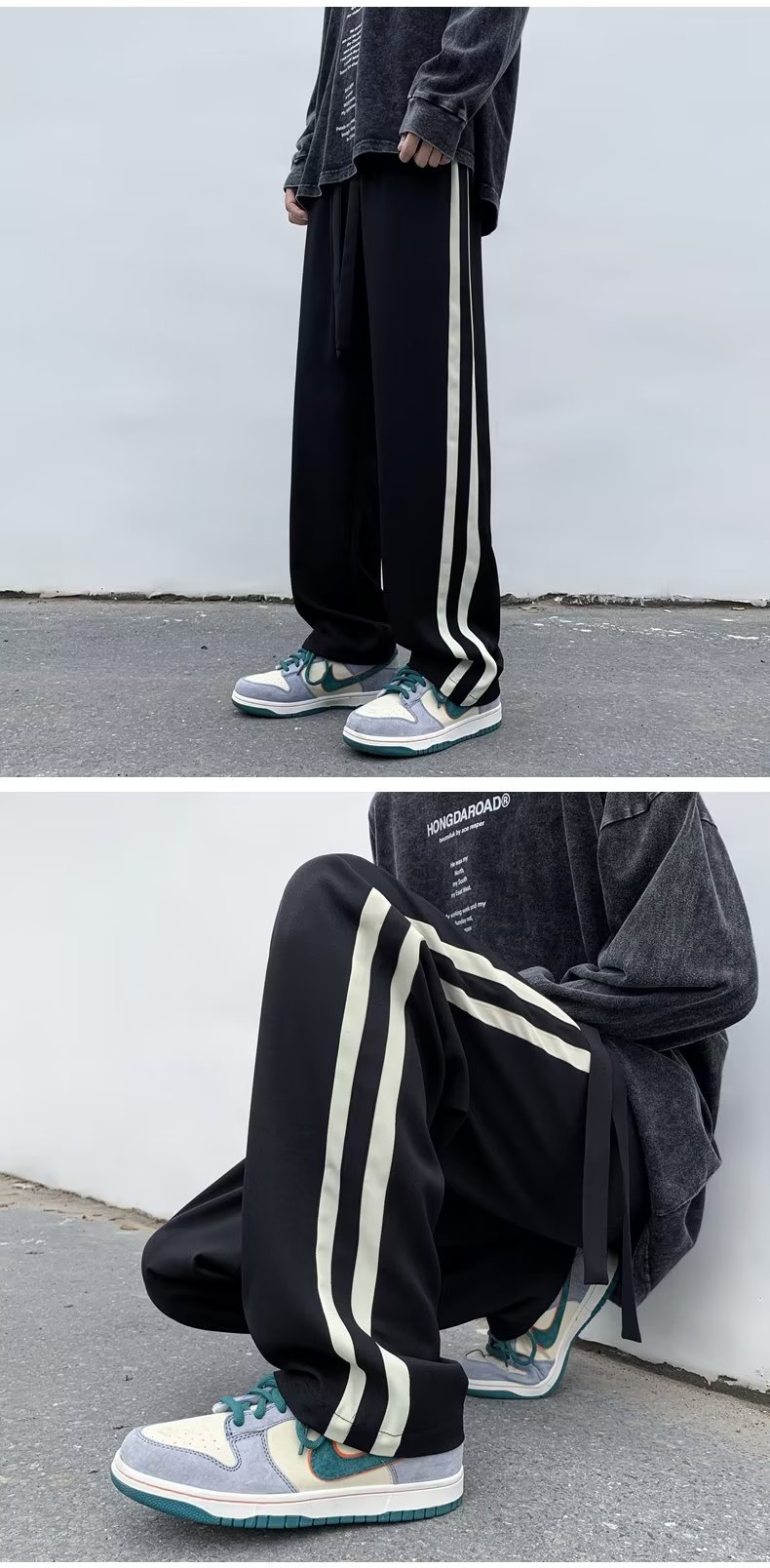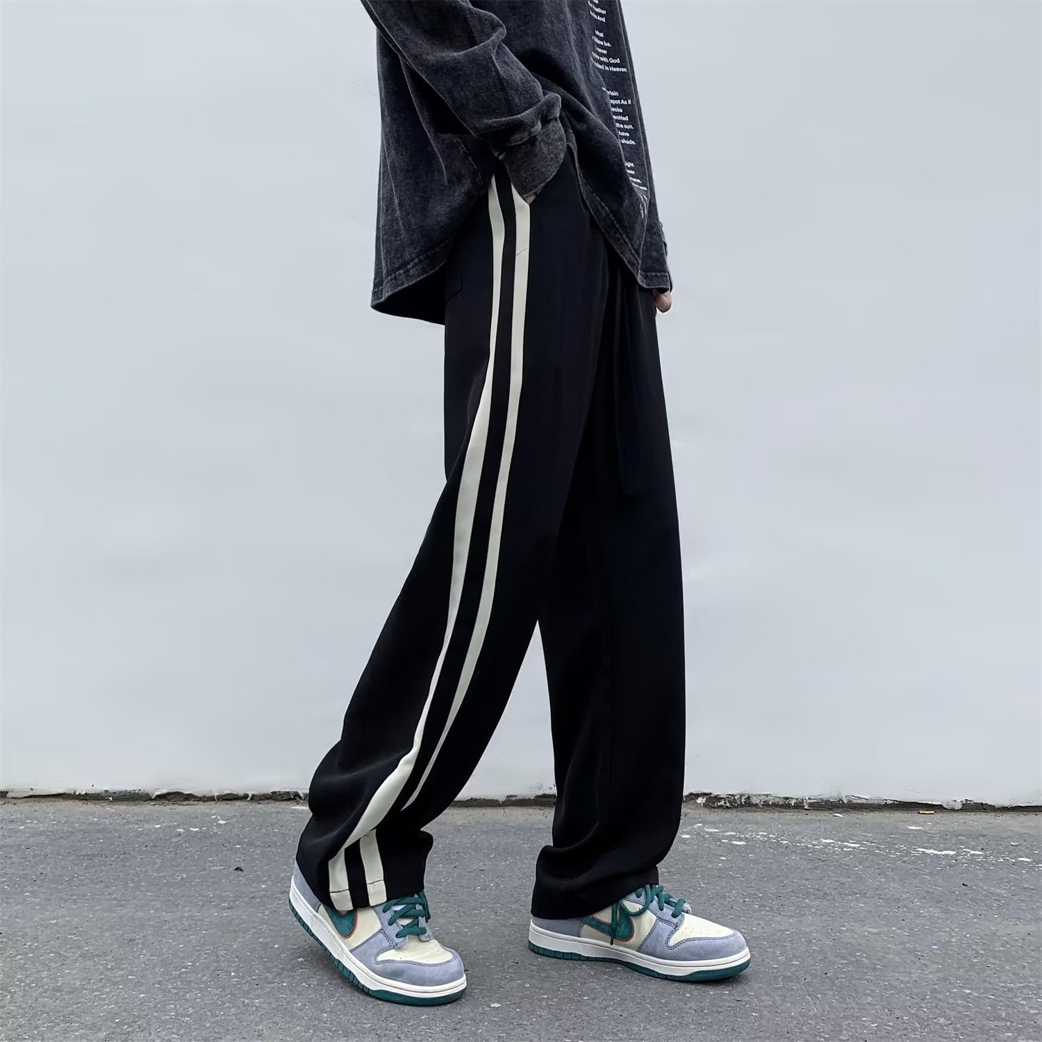 봄과 가을 캐주얼 스트라이프 와이드 레그 바지 남자 느슨한 플러스 사이즈 스트레이트 바지 홍콩 스타일 트렌디 올 매치 스포츠 바지스토어 가기