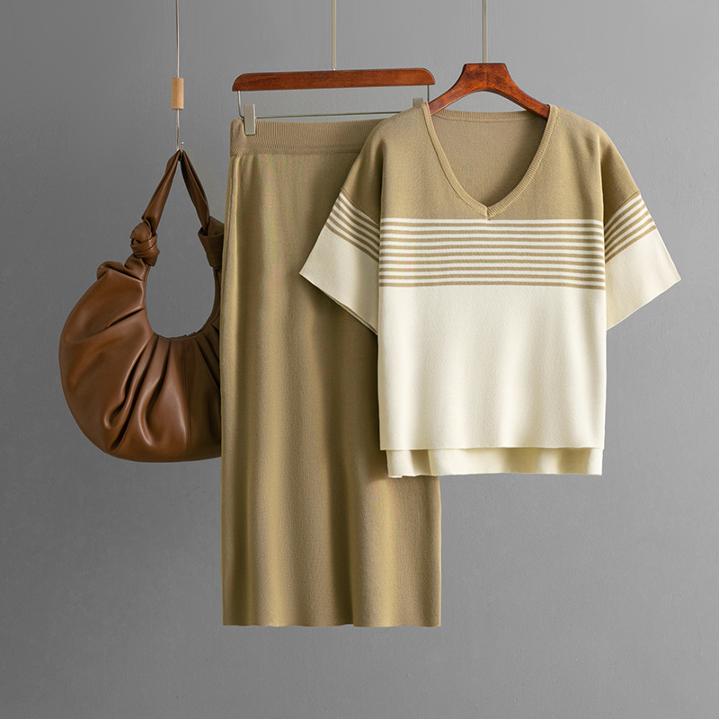 2025 여름 새로운 패션 스트라이프 반팔 V 넥 티셔츠 세트 캐주얼 스커트 투피스 세트스토어 가기