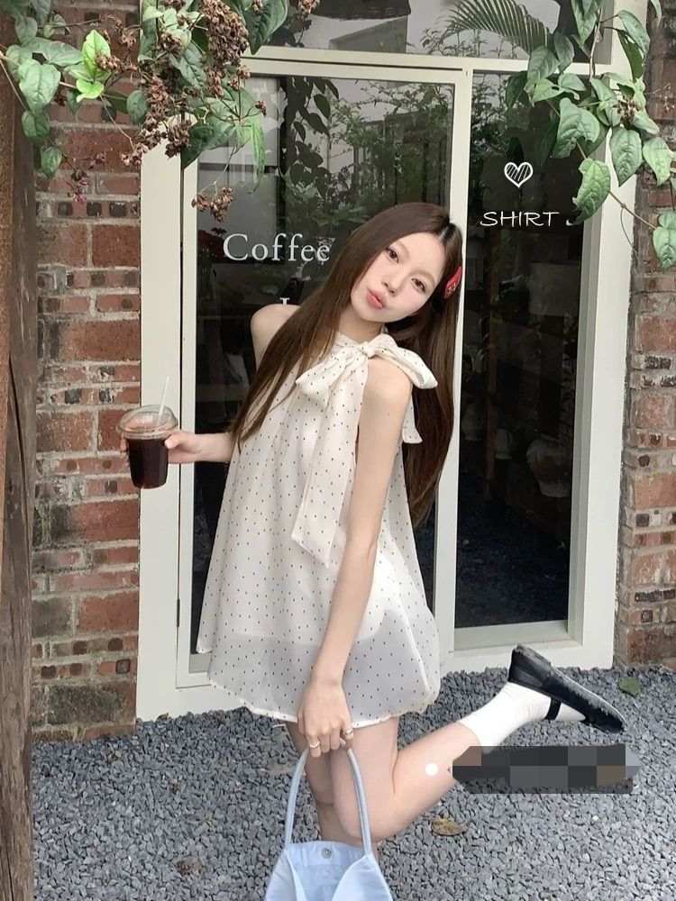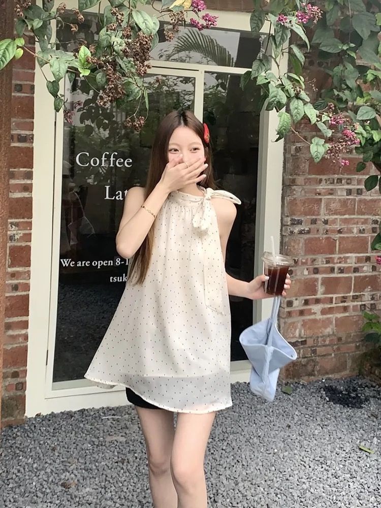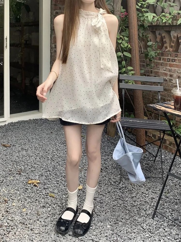 민소매 셔츠 디자인 센스 틈새 탑 활 폴라 도트 넥 셔츠 여성의 여름 새로운 프랑스 스타일 부드러운 스타일스토어 가기