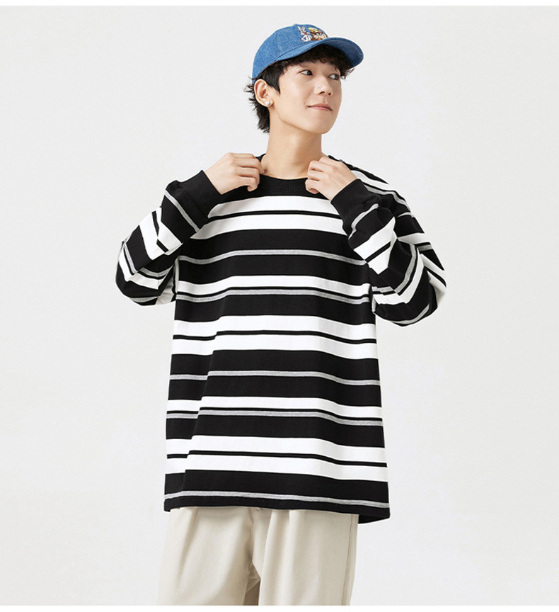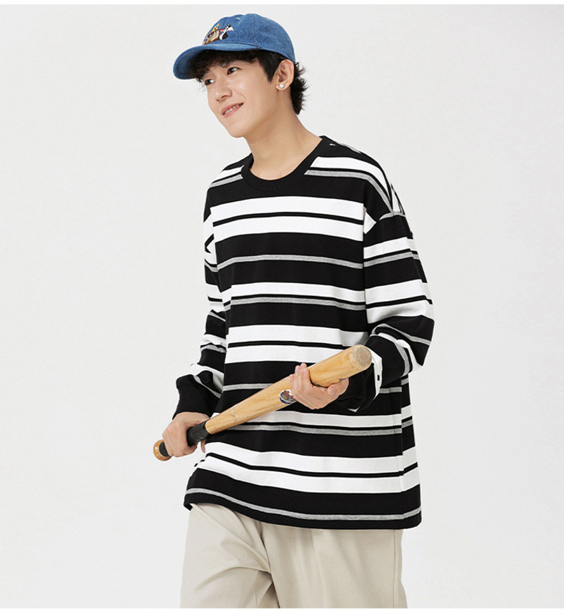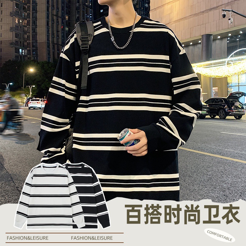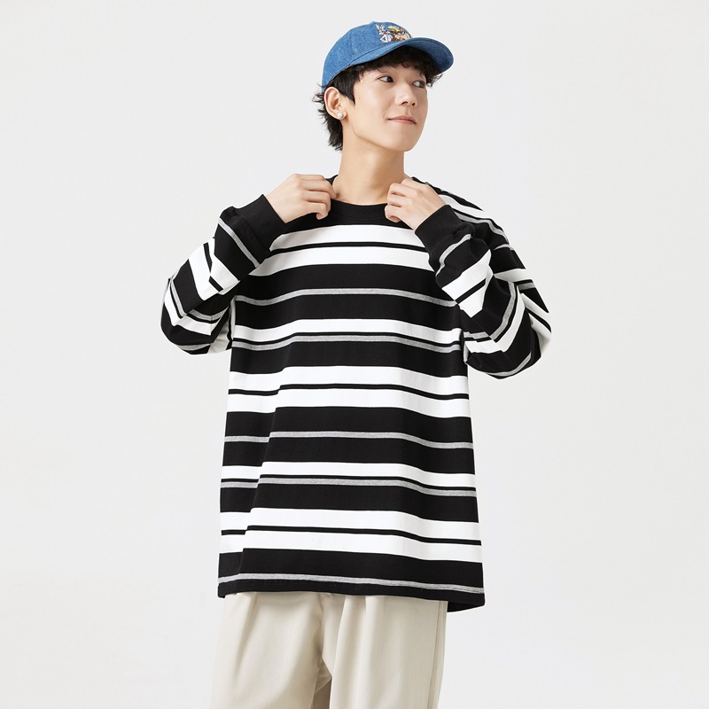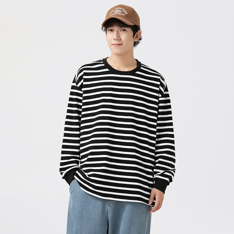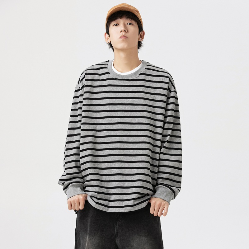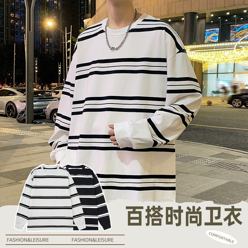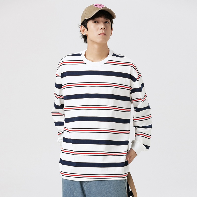 남성용 티셔츠 가을 퓨어 코튼 트렌디 브랜드 남성용 느슨한 캐주얼 의류 올매치 스트라이프 탑 긴팔 티셔츠 남성용스토어 가기