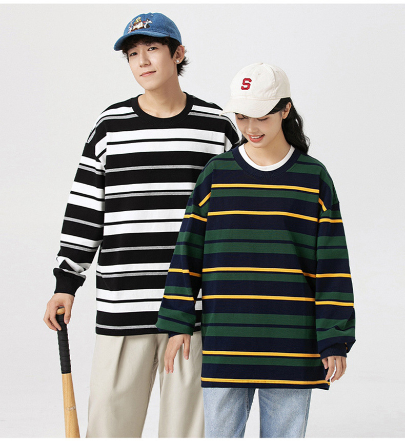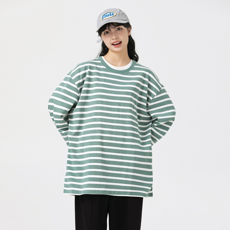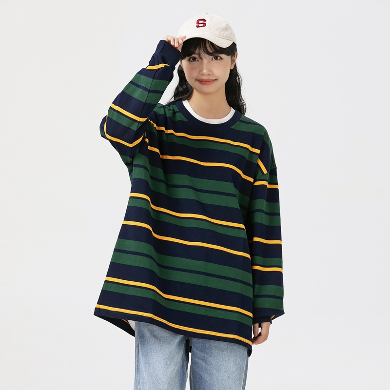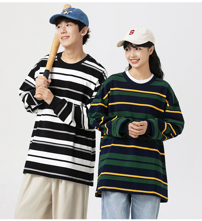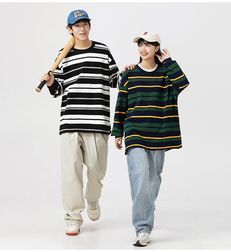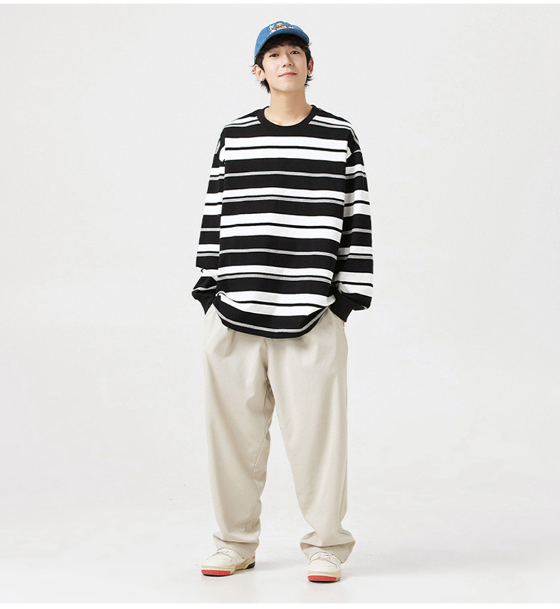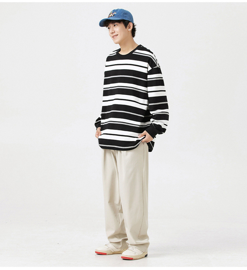 남성용 티셔츠 가을 퓨어 코튼 트렌디 브랜드 남성용 느슨한 캐주얼 의류 올매치 스트라이프 탑 긴팔 티셔츠 남성용스토어 가기