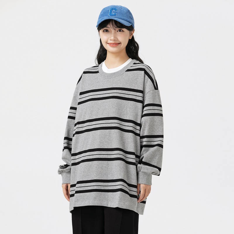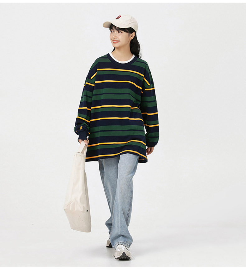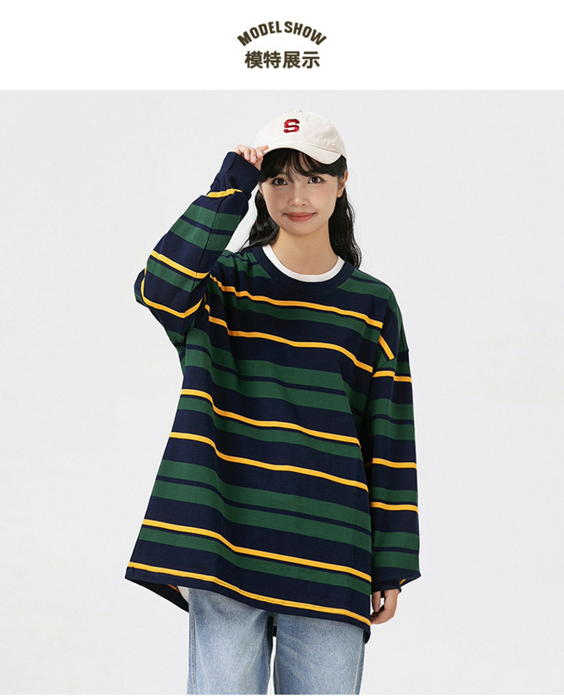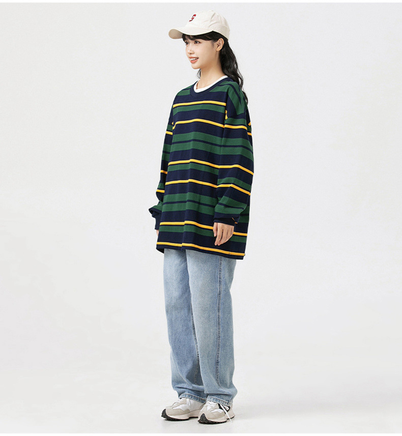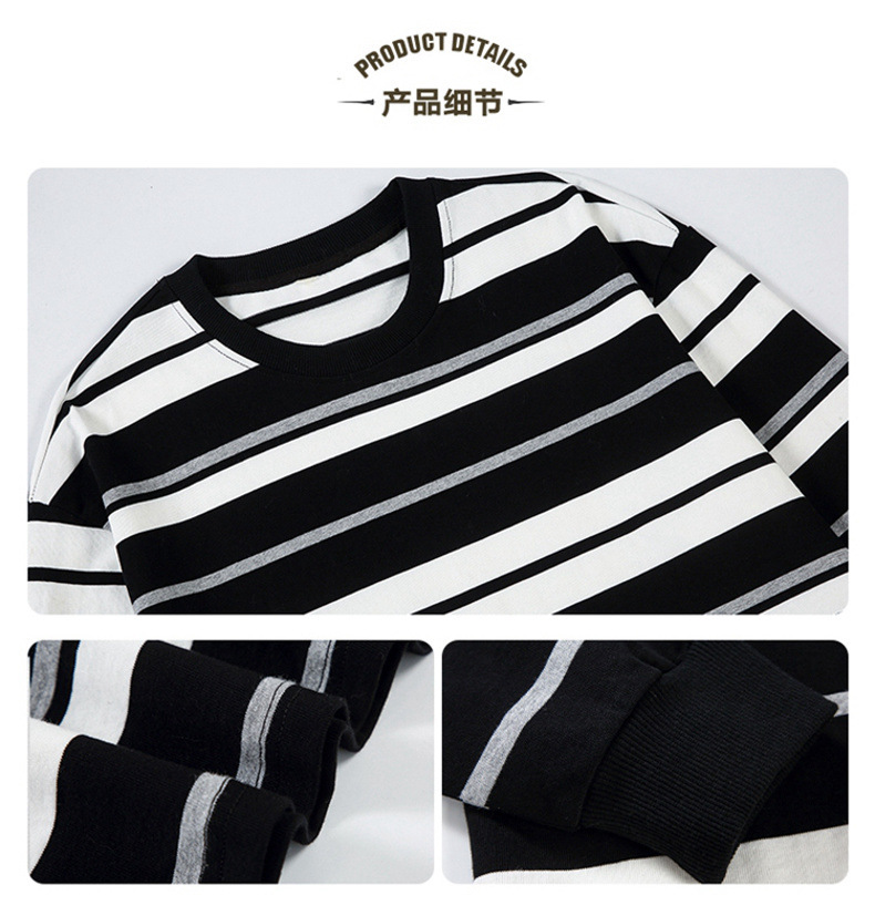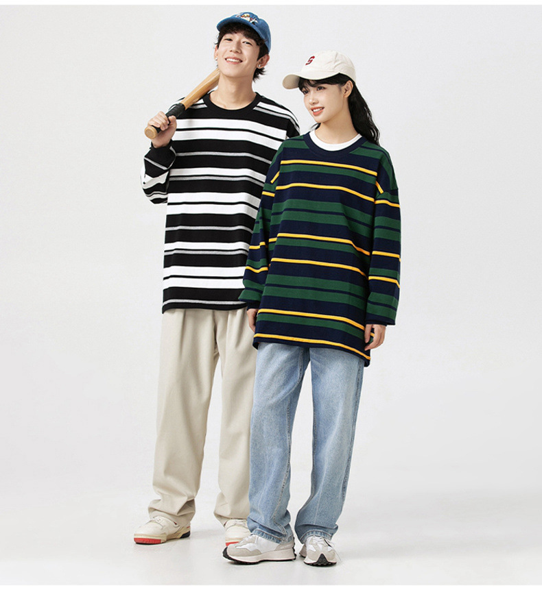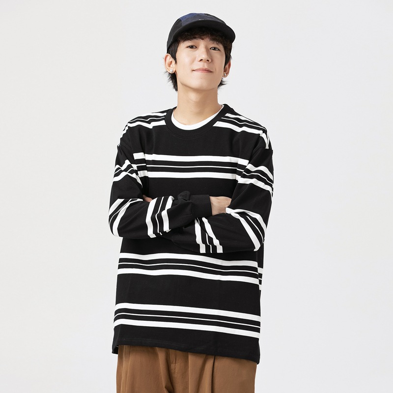 남성용 티셔츠 가을 퓨어 코튼 트렌디 브랜드 남성용 느슨한 캐주얼 의류 올매치 스트라이프 탑 긴팔 티셔츠 남성용스토어 가기