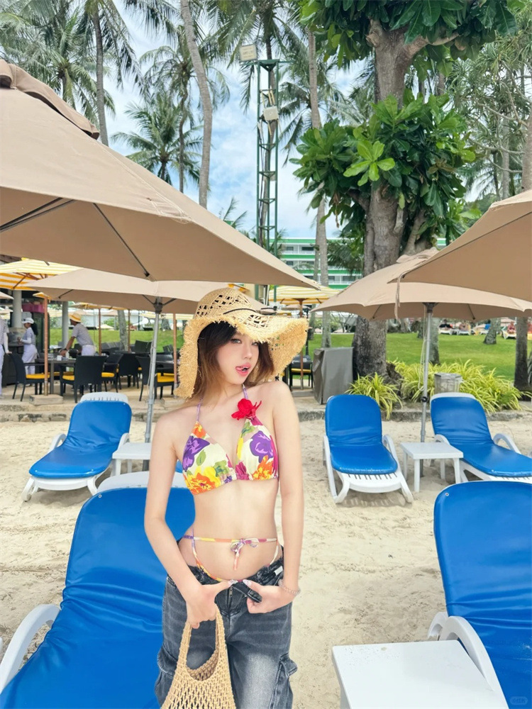 新款时尚花朵彩色印花性感挂脖分体系带辣妹风海边度假比基尼泳衣