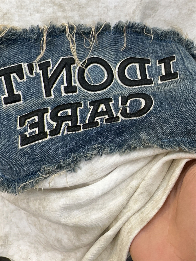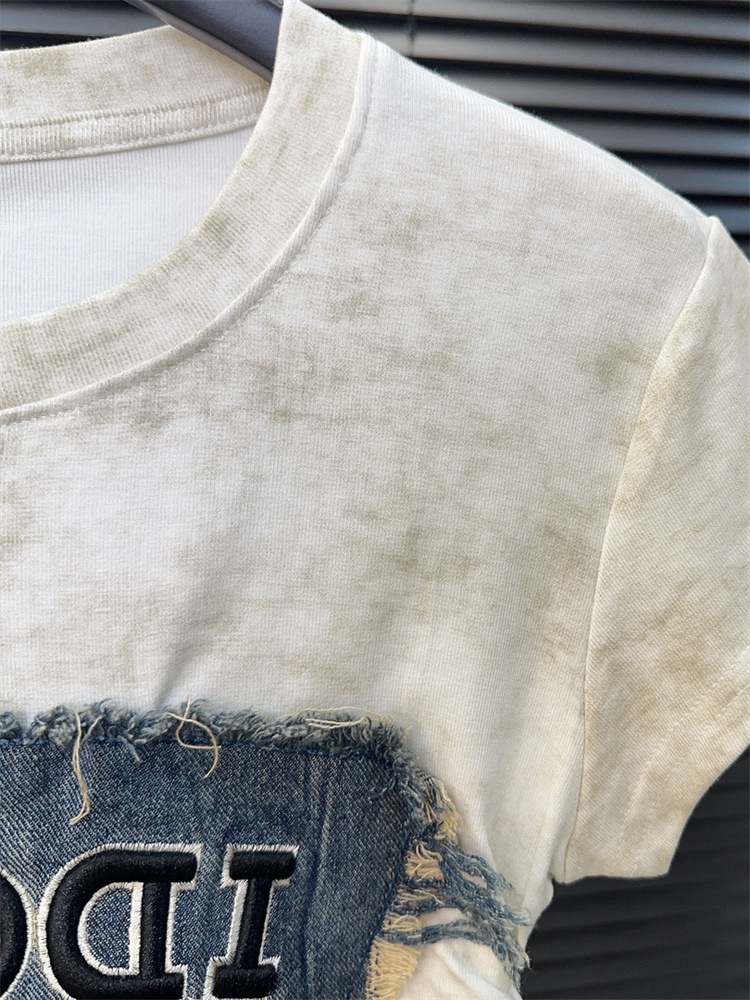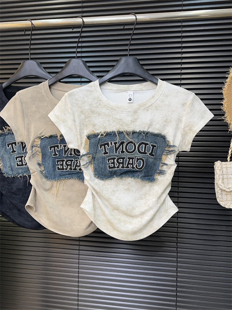슬림핏 넥타이 염색 데님 테이프 티셔츠 여성 봄과 여름 2024 새로운 캐주얼 플리츠 디자인 올매치 라운드 넥 탑스토어 가기